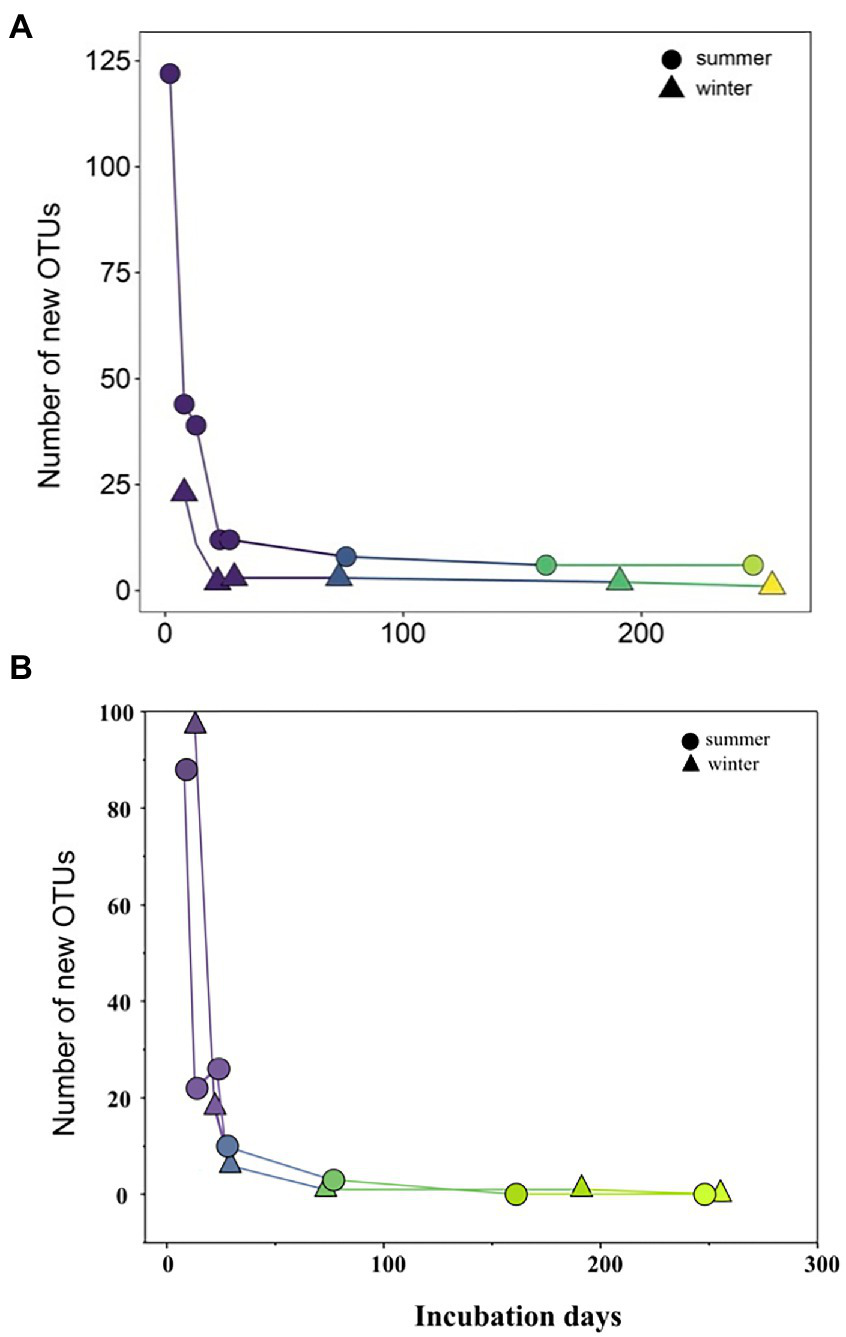 Newly occurred (A) and lost (B) microbial ASVs along summer and winter successions.