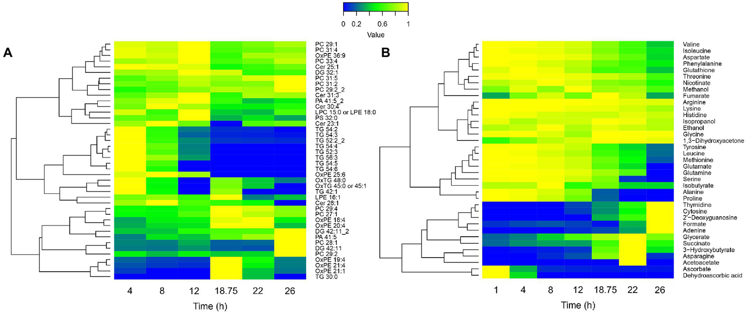 Lipidomic (A) and extracellular metabolomic (B) longitudinal data heatmaps of B. pertussis culture. Lipid intensities and metabolite concentrations are represented from 0 (blue) to 1 (yellow), 1 representing the maximum intensity/concentration of every feature. Features are clustered according to their trajectory similarities throughout the culture. Cer, ceramide; DG, diglycerides; LPC, lysophosphatidylcholine; LPE, lysophosphatidylethanolamine; Ox, oxydated; PA, phosphatidic acid; PC, phosphatidylcholine; PE, phosphatidylethanolamine; PG, phosphatidylglycerol; PS, phosphatidylserine; and TG, triglycerides.