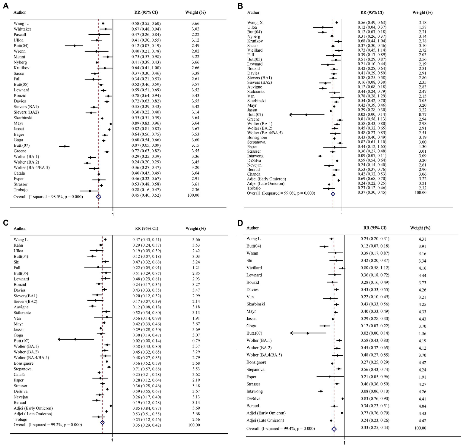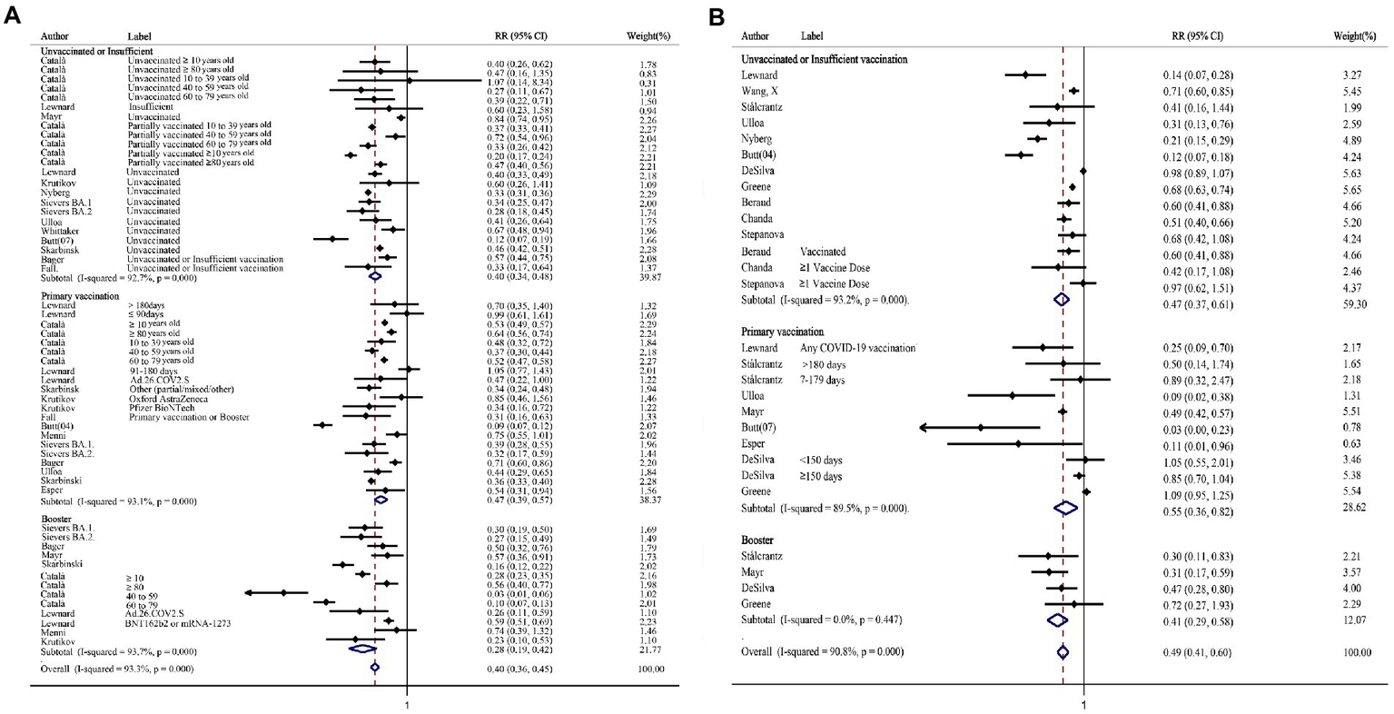 Forty-three studies were included, with 3,812,681 and 14,926,841 individuals infected with SARS-CoV-2 Delta and Omicron variant, respectively. The relative risks of hospitalization, death, ICU admission, and mechanical ventilation use after infection with the Omicron variant were all significantly reduced compared those after infection with the Delta variant (RRhospitalization = 0.45, 95%CI: 0.40–0.52; RRdeath = 0.37, 95%CI: 0.30–0.45; RRICU = 0.35, 95%CI: 0.29–0.42; RRmechanical ventilation = 0.33, 95%CI: 0.25–0.44). The change of both absolute and relative risks for hospitalization was more evident (RR = 0.47, 95%CI: 0.42–0.53;RD% =10.61, 95%CI: 8.64–12.59) and a significant increase was observed for the absolute differences in death in the elderly (RD% = 5.60, 95CI%: 4.65–6.55); the change of the absolute differences in the risk of hospitalization and death were most markedly observed in the patients with booster vaccination (RD%hospitalization = 8.60, 95CI%: 5.95–11.24; RD%death = 3.70, 95CI%: 0.34–7.06).