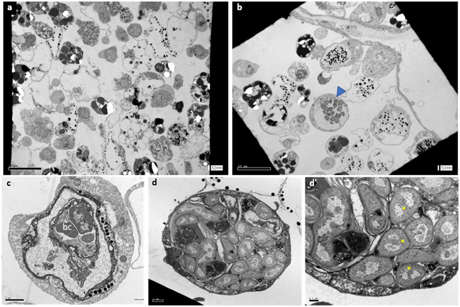 TEM sections of B. aff. leachii vasculature and hemocytes in active, mid-torpor and fully torpid states. (A) An active phenotype, no cell-containing bacteria. Bar-10 μm. (B) A torpid colony, bacteria cells within the cytoplasm of some circulated hemocytes (a blue arrowhead). Bar-10 μm. (C) Bacteria-containing cells, phenotype 1-a 12 μm animal cell containing 2 vacuoles, the inner vacuole holds 3 intact bacteria cells. Bar-2 μm. (D) A bacteria-containing cell, phenotype 2- a 22 μm cell holding 22 intact bacteria cells. (D’) The bacteria cell wall is double layered, as some of the naked DNA that is at the state of binary fission (yellow asterisks). Bar-0.5 μm.