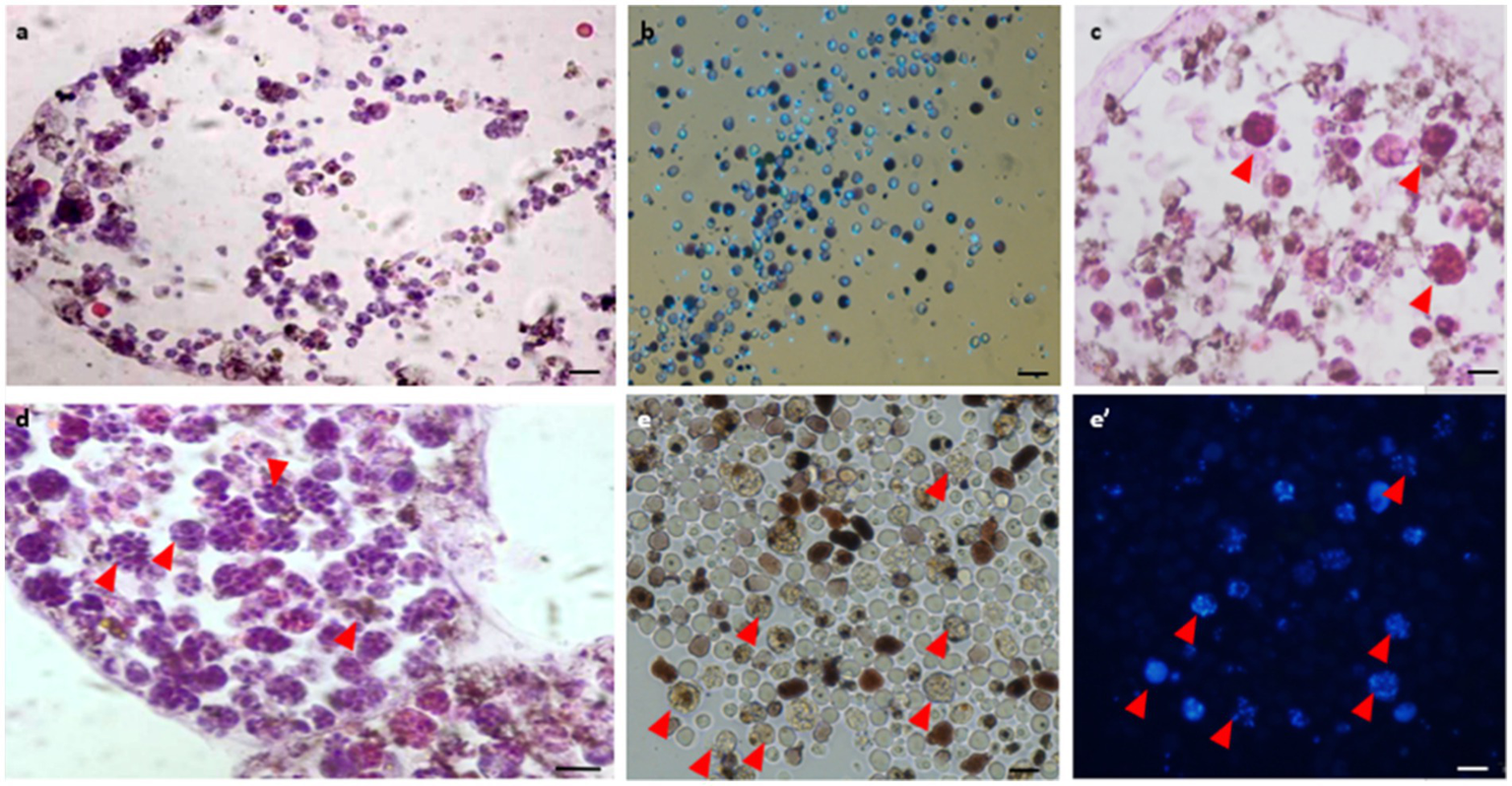 Histological observations performed on active colonies (n = 12) and in Hoechst-stained isolated cells showed no evidence of bacteria within either vasculature or in isolated hemocytes under in vitro conditions (Figures 3A,B). In mid-torpor colonies (n = 6), 1–4% of the hemocyte populations appeared as large hemocytes (10–15 μm) containing several stained ‘nuclei’ (2–13) within each cell membrane, suggesting the appearance of bacteria cells (Figure 3C, red arrowheads). In the fully torpid colonies (n = 8), high proportions (10–70%) of the hemocyte populations appeared as large hemocytes (10–30 μm) populated by ‘nuclei’ (n = 5–15), further suggesting that some of the multinucleate cells are of bacteria inclusive cells (Figures 3D,E,E’, red arrowheads). Only TEM observations were able to differentiate between multinucleate cells and cells with bacteria.
