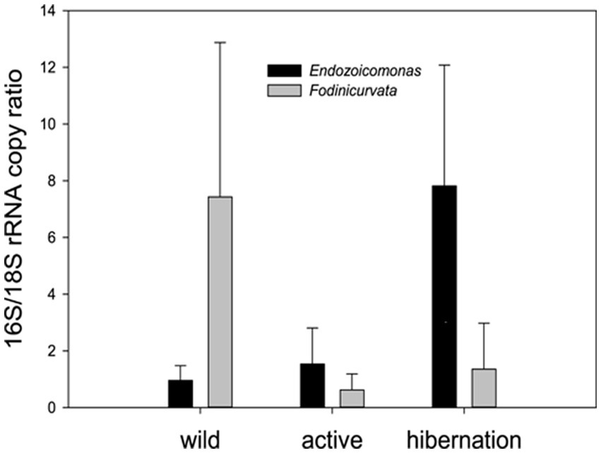 qPCR quantification of the two key bacteria associated with B. leachii hibernation– the ratio between the copy numbers of the rRNAs: bacterial 16S to the host 18S. Endozoicomonas was significantly enriched in the hibernation state (n = 5), compared to freshly collected (wild n = 5) and laboratory-grown samples (active n = 5). Fodinicurvata was highly abundant in some freshly collected samples. One-way ANOVA: Endozoicomonas along different stages F (2,12) = 9.915, p = 0.0038 Fodinicurvata F(2,12) = 1.913, p = 0.19.