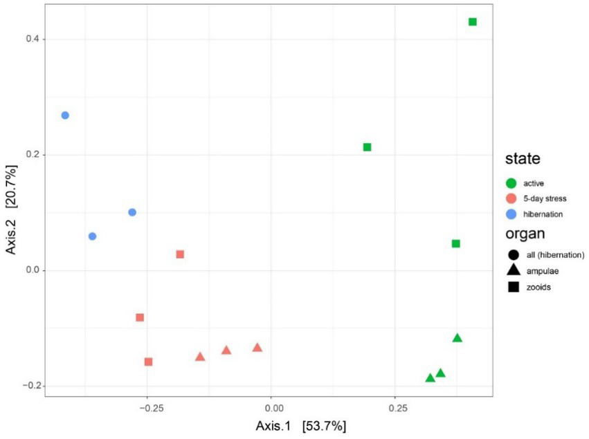 Microbiota varies between different physiological states (active, mid-torpor, and full-torpor colonies) and tissue types (vasculature and zooids) in Botrylloides leachi. Principal Coordinates Analysis (PCoA) based on the Bray–Curtis dissimilarity matrix of transcriptomic rRNA full-length read abundances.