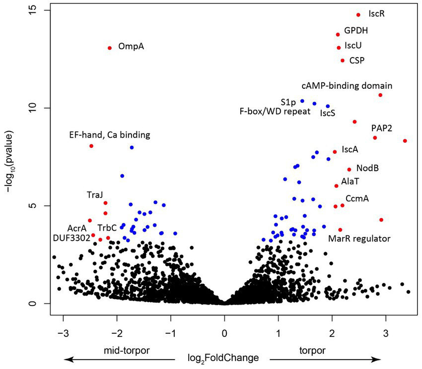 Volcano plot showing the key features upregulated in the mid-torpor and torpid states. Each dot represents a gene, blue if the adjusted p value < 0.01, red if log2 fold change >1 and adjusted p value < 0.05. Selected genes were annotated using the protein product nomenclature. GPDH is glycerol-3-phosphate dehydrogenase [NAD(P)+] (EC 1.1.1.94). CSP is a cold shock protein. PAP2 is a putative membrane-associated phospholipid phosphatase, PAP2 superfamily.