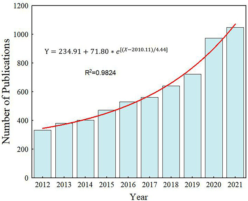 Bibliometric analysis is a method to analyze the research characteristics and change trends of literature by using a variety of mathematical and statistical techniques (Liu et al., 2019). Using this method, we can quantitatively calculate the literature overview, cooperative relationship, research hotspots, and scientific research development trends of a certain research field (Guan et al., 2021). Bibliometric analysis has been widely used in academic research, especially in the field of microorganism. For example, Yuan et al. (2021) and the others summarized the research focus and trends of human intestinal microorganisms from 2010 to 2021 through bibliometrics; Ekundayo et al. (2021) published a global bibliometric meta-analytic assessment of research trends on microbial chlorine resistance in drinking water/water treatment systems in 2021. CiteSpace, a visual analysis tool, which is used to capture trends and patterns in the scientific literature (Chen et al., 2014). CiteSpace can be used to explore the scientific domains in a research community from the perspective of problem solvers and discoverers (Guan et al., 2021).