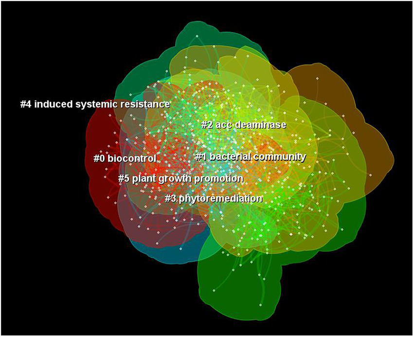 The keywords have highly refined and summarized the core content of the article, and their frequency can reflect the research direction and content of a certain field (Zhang Z. et al., 2020). Through the analysis of the keywords co-occurrence networks, the development trend of a certain field can be identified, and the research status in this field can be grasped (Yan et al., 2021). After analyzing the co-occurrence graph of a single keyword, we used the log-likelihood ratio (LLR) algorithm to draw the co-occurrence cluster graph of keywords. Co-occurring clusters were arranged according to their size. A total of 6 co-occurrence clusters were obtained (Figure 4), including “bio-control” (#0), “bacterial community” (#1), “ACC deaminase” (#2), “phytoremediation” (#3), “induced systemic resistance” (#4), and “plant growth promotion” (#5). Each cluster was discussed in detail below to better describe the hot topics in the rhizosphere microorganisms’ field during the study.