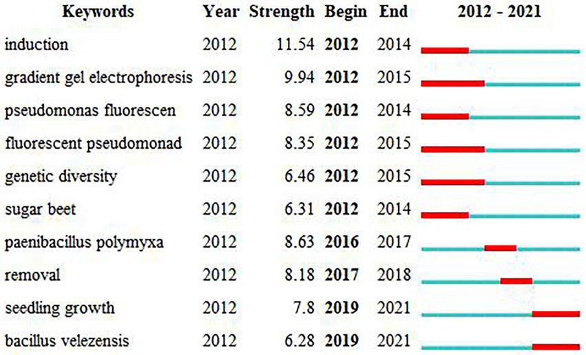 We used burst detection to identify articles that attracted the attention of peer researchers during the study period (Liu et al., 2022). The top keywords with the most robust citation burst were shown in Figure 5. There were 51 keywords with the top burst strength among the total keywords. We were particularly interested in those keywords with research significance, which indicated the evolving trend of rhizosphere microorganisms (Figure 5). During the study period from 2012 to 2021, induction had the highest burst strength, followed by gradient gel electrophoresis, Paenibacillus polymyxa, and Pseudomonas fluorescen. Simultaneously, we can see that seeding growth and bacillus velezensis became the research focus after 2019, and may also be the research hot spots in the future period.