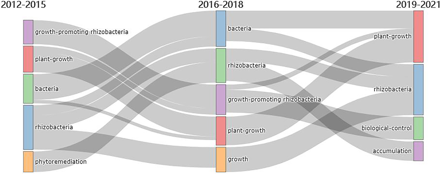 Thematic evolution map of publications in rhizosphere microorganism from 2012 to 2021.