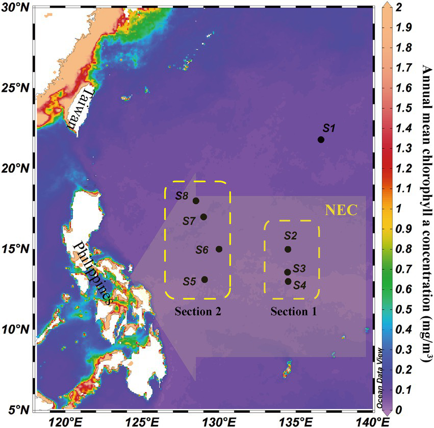 Location of eight water column sampling sites (black circles) and schematic illustration of the influence range of North Equatorial Current (NEC, yellow arrow) in the western tropical Pacific Ocean. Yellow boxes indicated two sections in the NEC influence area. The background was the annual mean chlorophyll a concentration (mg/m3).