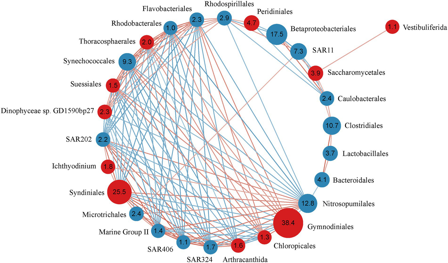 Correlation relationship with the order (relative abundance of >1%) comprising bacteria and microeukaryotes across 43 samples. The network shows strong (R = 0.4) and significant (p < 0.05) Spearman rank correlation coefficients. Red circles represent microeukaryotic orders, blue circles represent bacterial orders. Numbers in the circles are the relative abundance of bacterial/microeukaryotic orders. Red lines indicate positive correlations, blue lines indicate negative correlations.