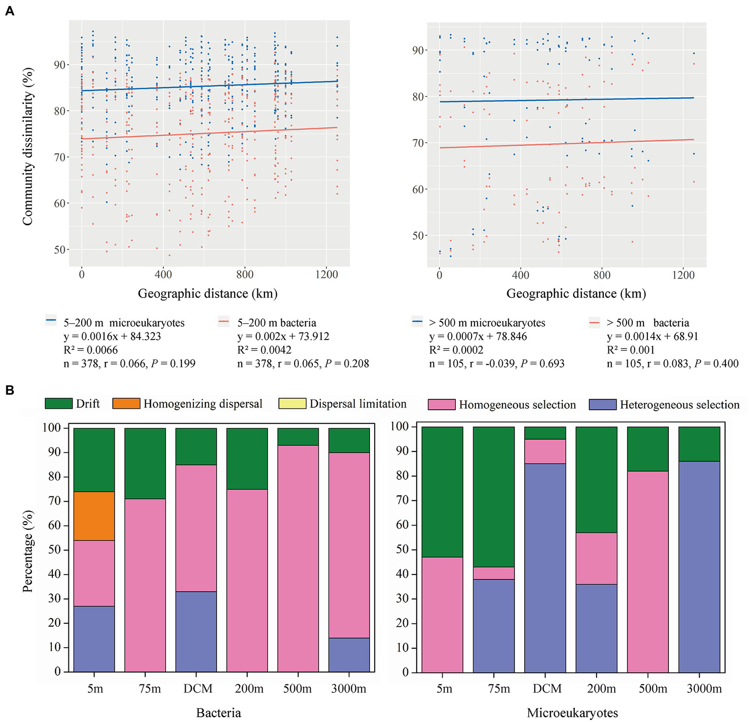 (A) Spearman’s rank correlations between the Bray–Curtis dissimilarity of microeukaryotic (blue dots and line) and bacterial (red dots and line) communities and geographic distance in the 5–200 m and > 500 m layers, the n is the number of comparisons. (B) Relative importance of ecological processes in shaping the bacterial and microeukaryotic communities across six depths.