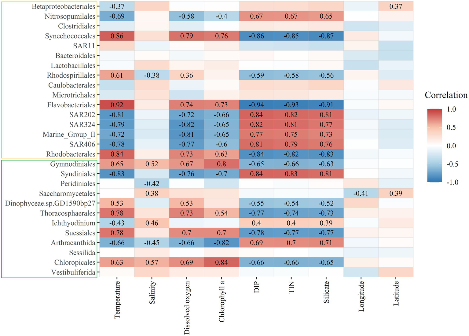 Heatmap depicting Spearman’s rank correlations between the relative abundances of main bacterial (yellow box) and microeukaryotic (green box) orders and environmental factors. Significant correlation coefficient values were marked in the figure. DIP, dissolved inorganic phosphate; TIN, total inorganic nitrogen.