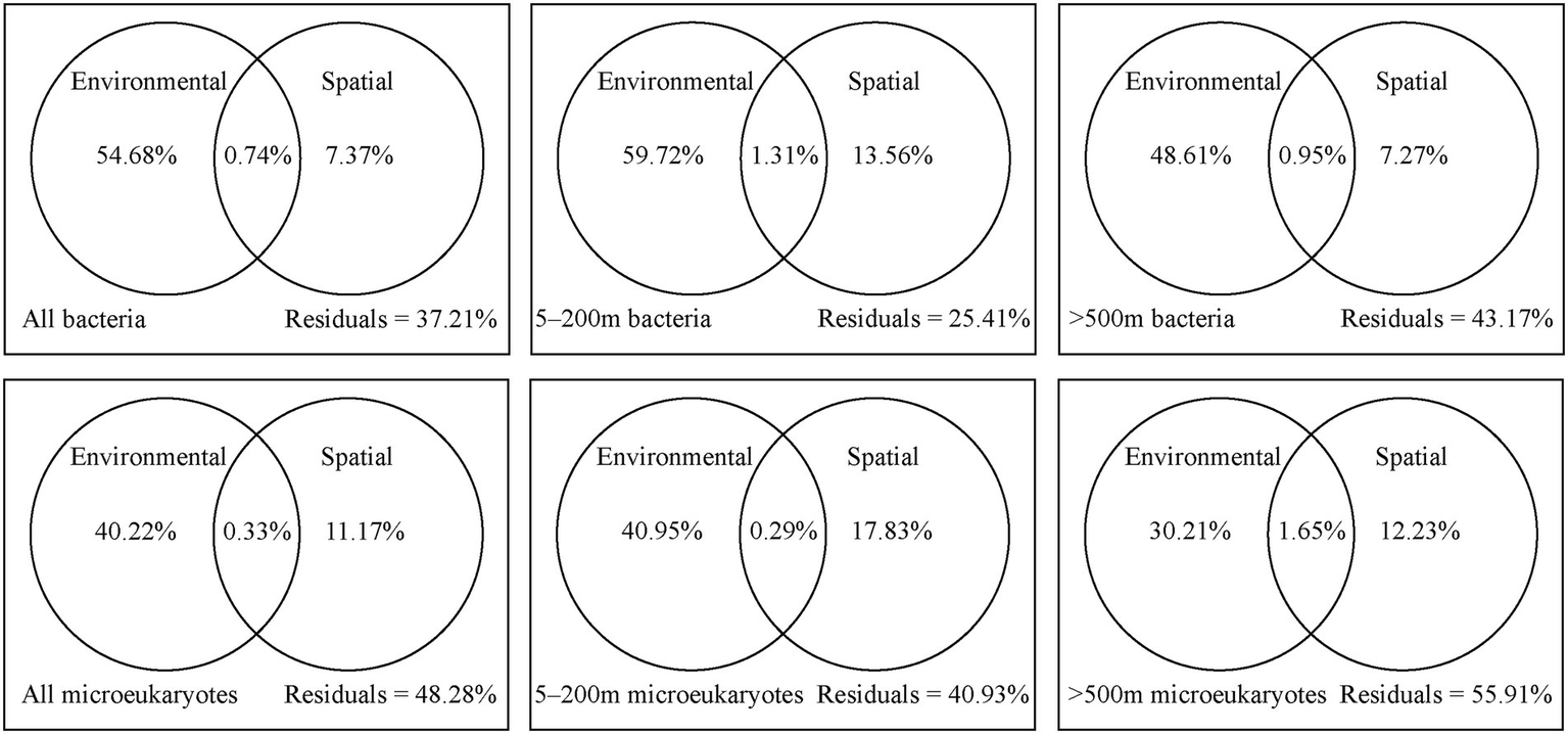 The variation partitioning analysis showed that environmental effects had a relatively higher contribution on the bacterial and microeukaryotic communities than spatial factors (Figure 6). Comparatively, bacteria were more affected by environmental factors, while microeukaryotes were more affected by spatial factors. For the 5–200 m layer, spatial and environmental factors collectively explained 74.59% of bacterial community variation and 59.07% of microeukaryotic community variation, and remaining variations were unexplained. Spatial factors explained 13.56% of bacterial community variation and 17.83% of microeukaryotic community variation, while environmental factors explained 59.72% of bacterial community variation and 40.95% of microeukaryotic community variation. For the >500 m layer, environmental and spatial explanatory factors for the bacterial and microeukaryotic community variations both decreased; more variations remain unexplained.