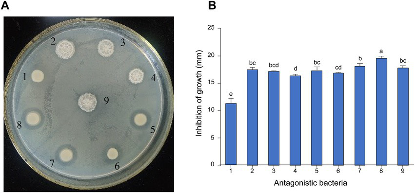 Screening and inhibition of E. amylovora by antagonistic bacteria. (A) The effect of antagonistic bacteria against E. amylovora. (1) Serratia marcescens D6; (2) Bacillus atrophaeus B4; (3) B. atrophaeus KB16; (4) B. atrophaeus KB14; (5) Priestia megaterium KB3; (6) S. marcescens D5; (7) P. megaterium KB17; (8) P. megaterium KD7; (9) B. atrophaeus B8. (B) Diameter of antagonistic inhibition zone of nine strains. Data with the same letters are not significantly different at p ≤ 0.05.
