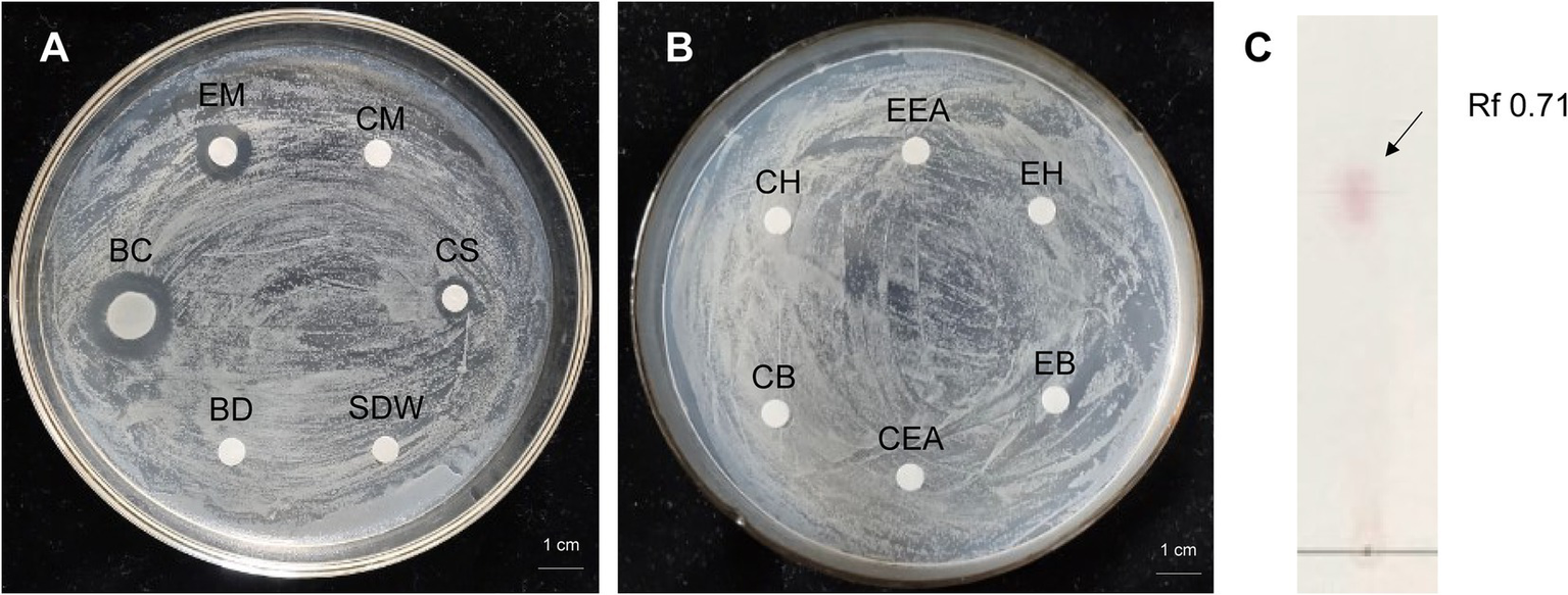 The antibacterial activity analysis of organic extracts from P. megaterium strain KD7 against Erwinia amylovora on NA medium (A,B), and separation of active compounds by thin layer chromatography (TLC) (C). EM, extracted with methanol; CM, methanol control; BC, bacteria culture broth (1.0 × 108 CFU/ml); CS, filtrate from the bacterial cell-free supernatant; BD, filtrate from the bacterial cell disruption; EH, extracted with n-hexane; CH, n-hexane control; EB, extracted with n-butanol; CB, n-butanol control; EEA, extracted with ethyl acetate; CEA, ethyl acetate control; SDW, sterile distilled water (control).