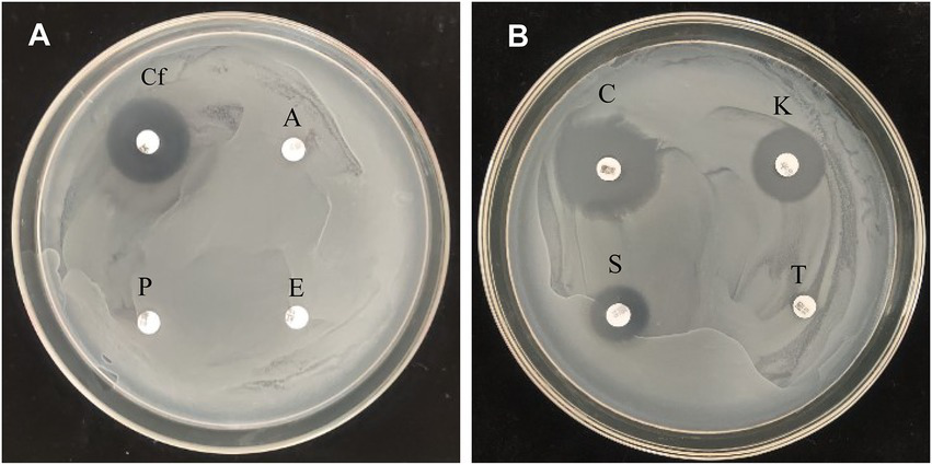 Antibiotic sensitivity test of P. megaterium KD7. (A)Cf, ciprofloxacin; A, ampicillin; E, erythromycin; P, penicillin. (B) C, cefotaxim; K, kanamycin; T, tetracycline; S, streptomycin.