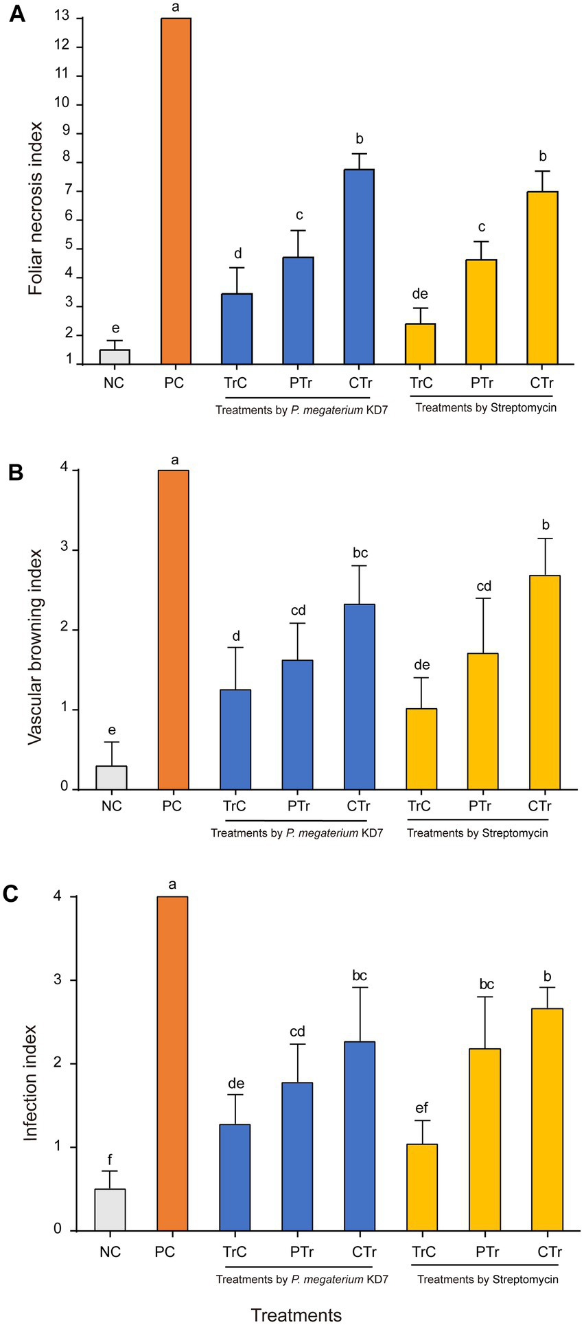 The disease index of fire blight in detached pear tissues treated with P. megaterium strain KD7 after 15 days post-inoculation (dpi): (A) leaves, (B) twigs and (C) fruits. NC, negative control; PC, positive control; TrC, treatment control; PTr, protective treatment; CTr, curative treatment. Means with the same letter are not significantly different at p ≤ 0.05.