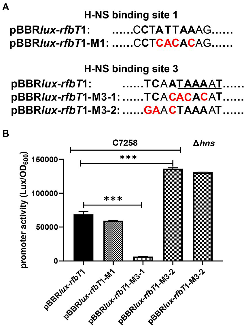 | pBBRlux-rfbT1-M3-2 | pBBRlux-rfbT1 with mutations in the front part of the H-NS binding site 3 | This study |