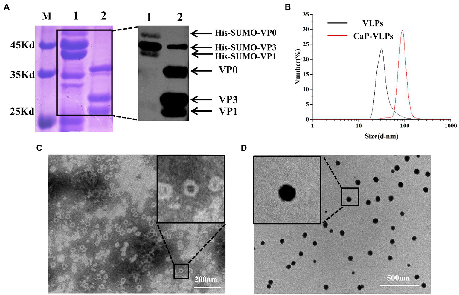Characterization of mineralized FMD CaP-VLPs. (A) SDS-PAGE and Western blot analysis of FMD VLPs. Lane 1: FMD structural proteins with His-SUMO tag, lane 2: FMD VLPs. (B) Identification of FMD VLPs and FMD CaP-VLPs with dynamic light scattering (DLS). (C) Transmission electron microscopy (TEM) observation of FMD VLPs. (D) TEM observation of FMD CaP-VLPs.