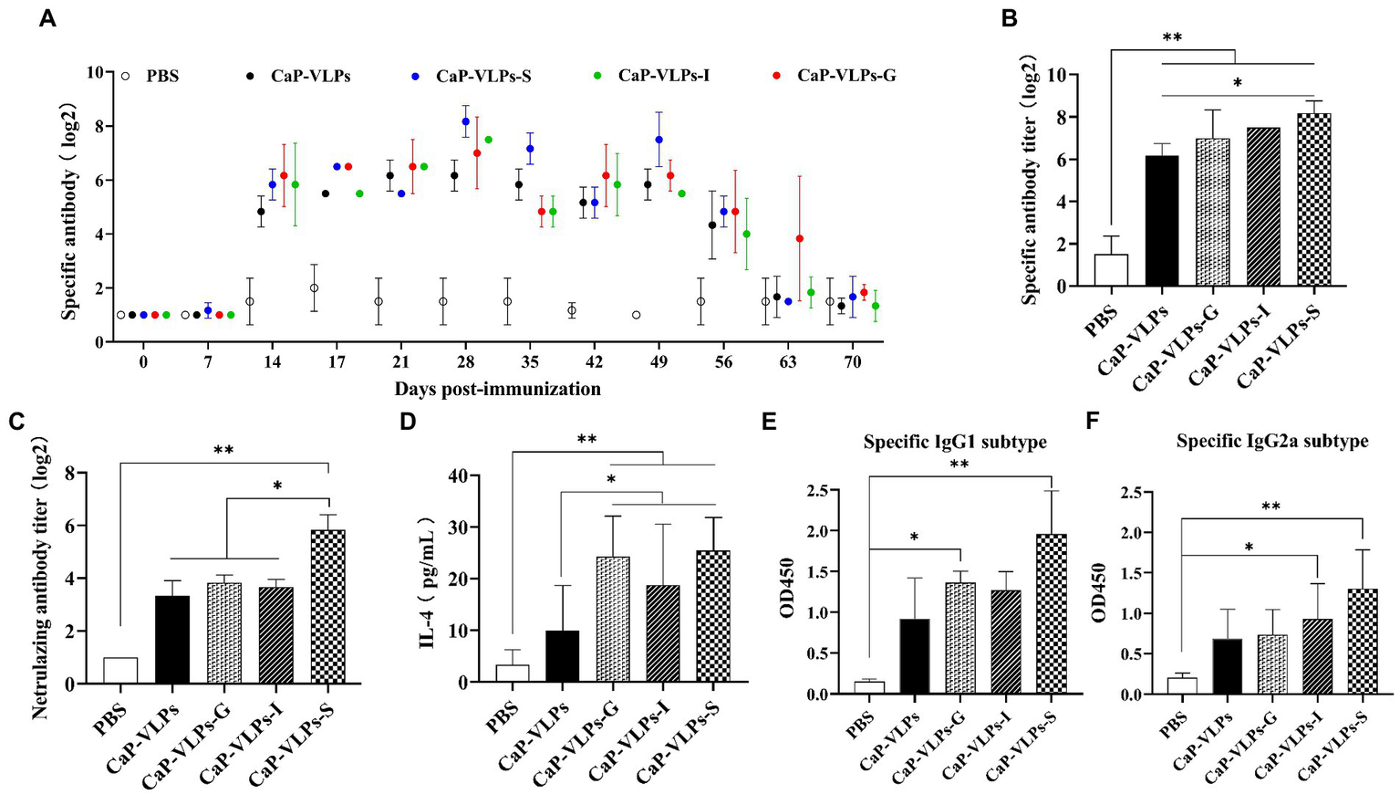 FMDV-specific humoral immune responses induced by CaP-VLPs in mice. (A) Changes in antibody titers against type-O FMDV were determined by LPBE assay after vaccination. (B) Titers of IgG of experimental groups on day 28 after the first immunization. (C) Titers of neutralizing antibodies of experimental groups on day 28 after the first immunization. (D) Content of IL-4 in the serum of mice on day 28 after the first immunization. (E) Content of the IgG1 subtype in serum on day 28 after the first immunization. (F) Content of the IgG2a subtype in serum on day 28 after the first immunization. Asterisks indicate significant differences (*p < 0.05, **p < 0.01).