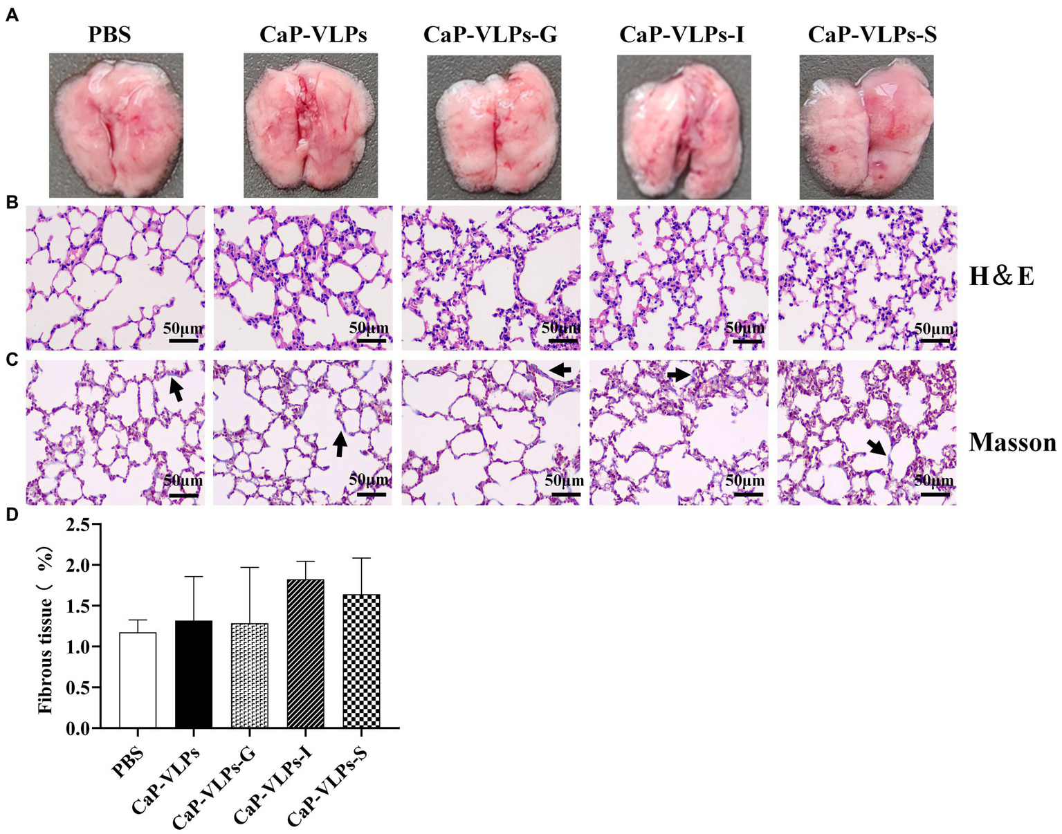 Biocompatibility is an important issue to consider when using an antigen carrier or adjuvant. To further confirm the biocompatibility of the mineralized complex, morphology and histopathology of the lungs were analyzed. Lungs with uniform pink color in all test groups exhibited normal macroscopic structure and no obvious change in volume, which is consistent with the lung mass and lung index shown in Figures 5B,C. Through histological observation and histopathological score, the lungs of each test group were shown to have a normal and complete histological structure. In summary, after immunization, there was no obvious pathological change in the lungs of each test group, CaP-VLPs vaccine has good biological safety.