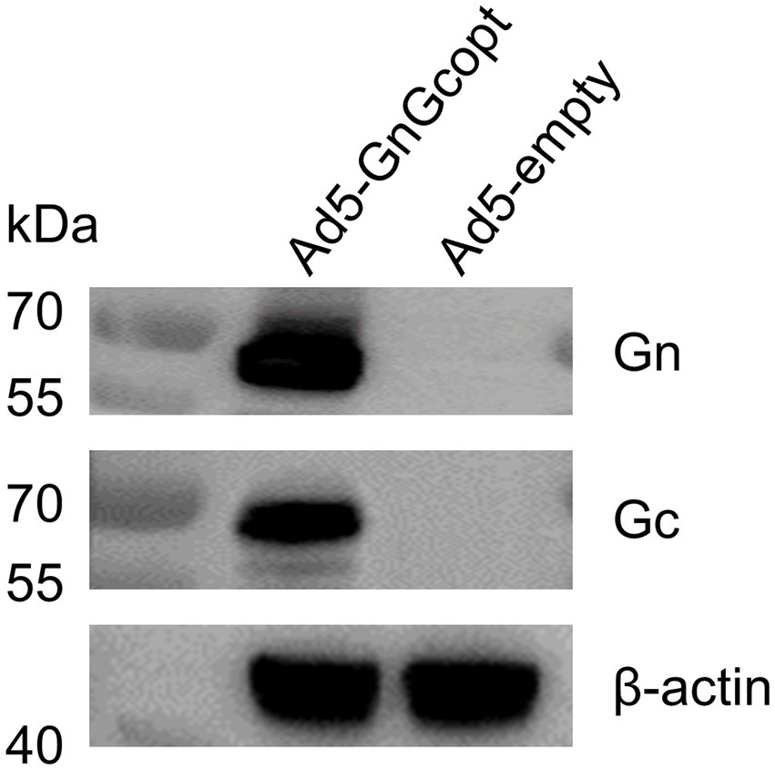 Characterization of rift valley fever virus (RVFV) vaccine Ad5-GnGcopt. Vero E6 cells were infected with Ad5-GnGcopt and Ad5-empty at a multiplicity of infection (MOI) of 10. The cells were collected 48 h after infection, and Western blotting was performed to identify the expression of antigenic proteins Gn and Gc.