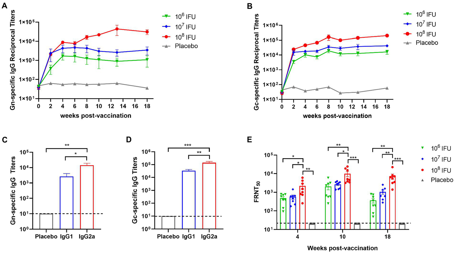 Durable humoral immune response elicited by Ad5-GnGcopt in BALB/c mice. BALB/c mice (n = 8) were intramuscularly immunized with a single dose of Ad5-GnGcopt (106, 107, or 108 IFU) or placebo. Sera were collected at 2, 4, 6, 8, 10, 13, and 18 weeks after vaccination. RVFV (A) Gn- and (B) Gc-specific IgG antibody titer was determined by ELISA. (C,D) Sera from the high-dose group collected on day 28 after immunization determined (C) Gn- and (D) Gc-specific IgG subclasses. (E) Serum samples collected 4, 10, and 18 weeks after vaccination were subjected to neutralizing antibody titers detection. Data are indicated as mean ± SEM. One-way ANOVA with multiple comparison tests calculated p values. *p < 0.05, **p < 0.01, ***p < 0.001.