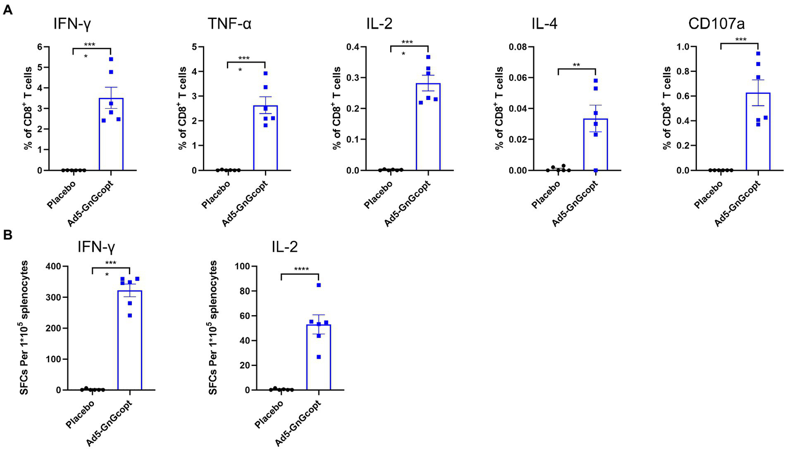 The cellular immune responses elicited by Ad5-GnGcopt in BALB/c mice. Four to six-week-old BALB/c mice (n = 6) were immunized with a single injection of Ad5-GnGcopt (108 IFU) or placebo. The splenocytes were collected 2 weeks after immunization. (A) The percentages of CD8+T cells secreting IFN-γ, TNF-α, IL-2, IL-4, and CD107a determined using intracellular cytokine staining assay. (B) IFN-γ and IL-2 secretion from mouse splenocytes detected by ELIspot. Data are shown as means ± SEM. Comparisons based on Student’s unpaired t-test with **p < 0.01, ***p < 0.001, and ****p < 0.0001.