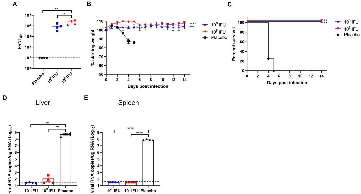 Protection efficacy of Ad5-GnGcopt against RVFV challenge in IFN receptor-deficient mice. A129 mice (n = 4) were injected with one dose of 106 and 108 IFU of Ad5-GnGcopt or placebo via the intramuscular route. Four weeks after vaccination, mice were challenged intraperitoneally with 2 × 104 TCID50 of the RVFV rMP-12 strain. (A) Sera collected at 4 weeks after vaccine immunization (before virus challenge) were examined for neutralizing antibodies using infectious RVFV. (B) Body weight change in mice after RVFV challenge. (C) The mortality and survival curves of mice. (D,E) Viral loads in livers (D) and spleens (E) of challenged mice were determined by qRT-PCR at the time of death (placebo group) or 14 days after the challenge (vaccine immunized groups). Data are displayed as means ± SEM. Comparisons for FRNT50 and viral RNA copies based on two-way ANOVA with Sidark’s multiple comparisons test with *p < 0.05, **p < 0.01, ***p < 0.001, and ****p < 0.0001. The weight curves were analyzed using one-way ANOVA (Multiple comparisons) test with *p < 0.05, **p < 0.01, ***p < 0.001, and ****p < 0.0001. The Kaplan–Meier survival curves were analyzed using the Log-rank (Mantel-Cox) test with *p < 0.05, **p < 0.01, ***p < 0.001, and ****p < 0.0001.