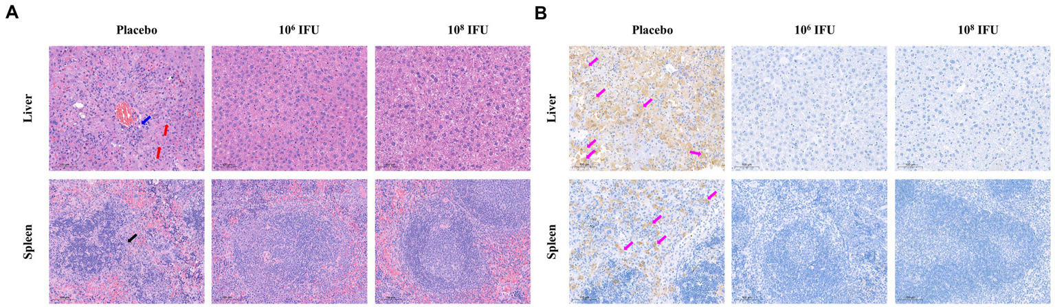 A129 mouse is a common animal model for studying virology, pathology, and immunology and for screening antiviral vaccines and medicines of many viruses, such as infection with Zika virus or RVFV (Ikegami et al., 2006; Zhu et al., 2017; Makris and Pavord, 2022). Therefore, A129 mouse was selected to explore the in vivo protection efficacy of Ad5-GnGcopt against RVFV challenge. In this experiment, A129 mice inoculated a single dose of 106 IFU, 108 IFU Ad5-GnGcopt, or placebo via intramuscular route, and the pre-challenge sera (4 weeks after vaccination) were collected for NAb detection. Our results show that both the106 IFU and 108 IFU groups produced high NAb titers against RVFV in A129 mice as determined by live virus neutralization assays (Figure 5A). All mice were challenged intraperitoneally with 2 × 104 TCID50 of RVFV rMP12 strain 4 weeks after vaccination. The body weight of each mouse was recorded daily for 14 days after RVFV challenge. The results indicated that the body weights increased steadily for both the106 IFU and 108 IFU groups decreased significantly for the placebo group (Figure 5B). All animals in the placebo group died within 4–5 days after the challenge, whereas mice in the vaccine-immunized group remained healthy and survived at the end of the experiment (Figure 5C). At 14 days after challenge, all surviving mice in the Ad5-GnGcopt immunized groups were euthanized, and the livers and spleens were collected for viral RNA loads, histopathological, and immunohistochemical assays. The assay about viral RNA loads indicated that the placebo-inoculated mice became infected, with 108.73 and 107.9 viral RNA copy equivalents per microgram of total RNA in livers and spleens at the time of death, respectively. By contrast, Ad5-GnGcopt-immunized mice were protected from RVFV infection, with almost no viral RNAs detected at the time of euthanasia (14 days after the challenge; Figures 5D,E). Histopathological examination indicated that severe microscopic liver lesions were observed in placebo mice at the time of death, characterized by hepatocyte steatosis, inflammatory cell infiltration, and scattered necrotic foci. Meanwhile, scattered splenic nodules atrophy was observed in splenic tissues. However, there were no pathological changes observed in the liver and spleen samples from all Ad5-GnGcopt vaccinated animals at the end of experiment (Figure 6A). Similarly, immunohistochemical assays detected many RVFV-positive signals in placebo mice, whereas no RVFV were detected in the livers and spleens fromAd5-GnGcopt vaccinated mice (Figure 6B). The above results demonstrate that a single low-dose immunization of Ad5-GnGcopt prevents RVFV replication in the liver and spleen and efficiently protects mice from lethal infection.