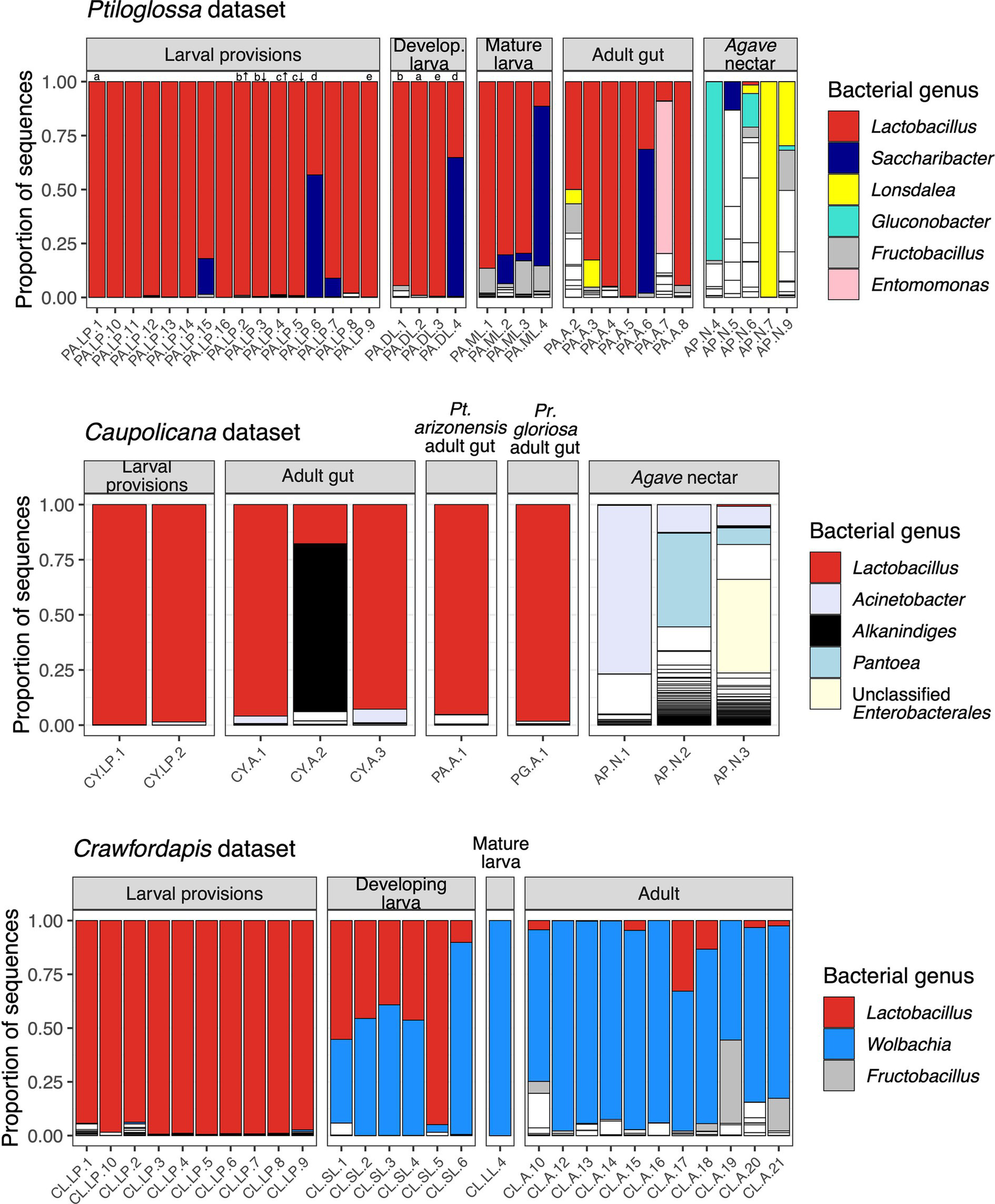 Figure 2. Bacterial composition of bees and nectar. Each column along the x axis is a different sample. Each bar, outlined in black, represents the relative abundance of different bacterial genera within samples. For clarity, only genera with ≥2% mean relative abundance across samples are colored; all others are white. In the Ptiloglossa dataset, letters above bars indicate samples that came from the same brood cell (a-e). For two brood cells (b and c), the top (indicated by ↑) and bottom (indicated by ↓) layers were sampled separately. Developing larvae are ordered left-to-right by increasing fresh weight, a proxy for age. In the Caupolicana dataset, all samples are of Caupolicana yarrowi unless otherwise noted.