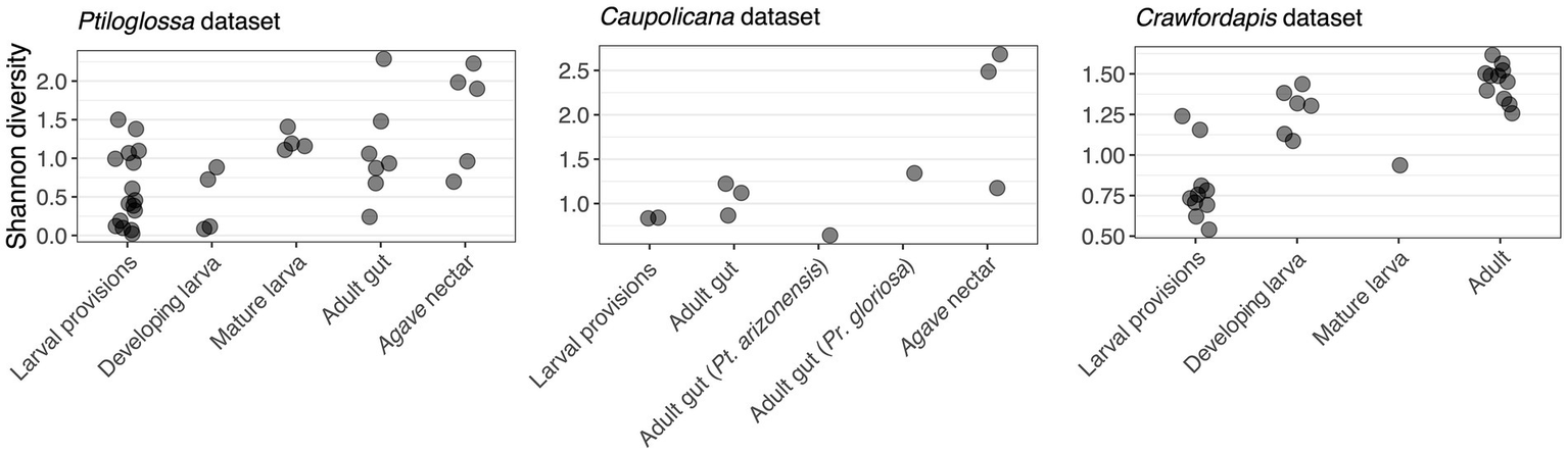 Figure 3. Shannon diversity, a measure of alpha diversity, of bee and nectar-associated bacterial communities. Each point represents a unique sample. In the Caupolicana dataset, all samples are of Caupolicana yarrowi unless otherwise noted.