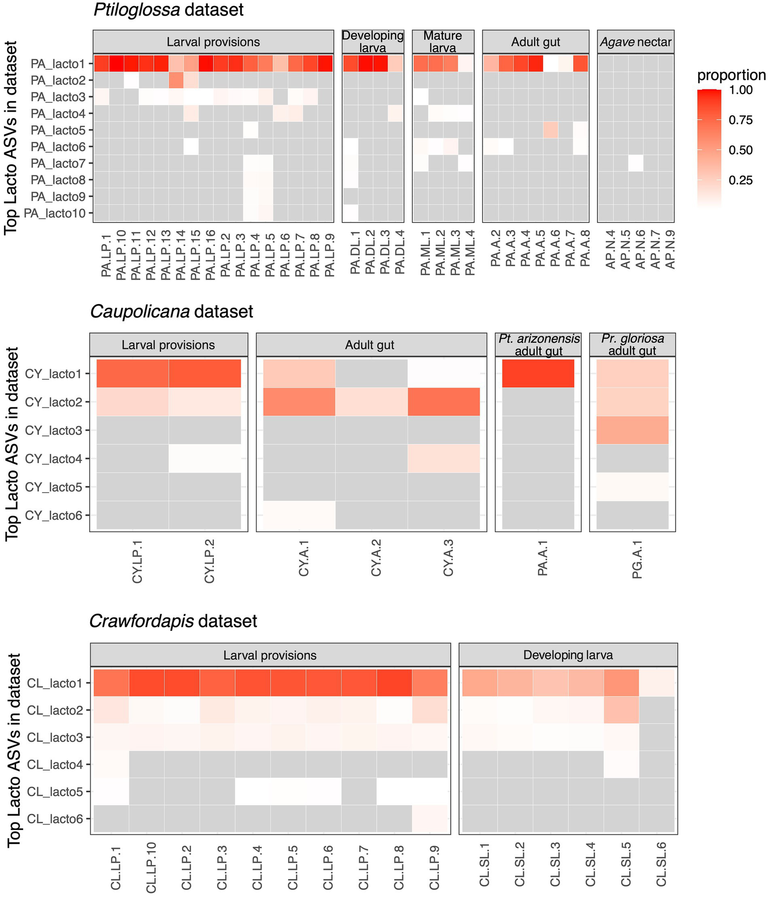 Figure 5. Heatmaps of the dominant ASVs classified as Lactobacillus for the three datasets. Columns represent individual bee or nectar samples. Rows represent up to 10 of the top ASVs (ranked by mean proportion across samples). Grey cells represent relative abundance values of <1%. Other cells are colored according to their relative abundance (proportion of sequences). Agave nectar is not shown in the Caupolicana dataset because no Lactobacillus ASVs were detected at ≥1% relative abundance. In the Caupolicana dataset, all samples are of Caupolicana yarrowi unless otherwise noted.