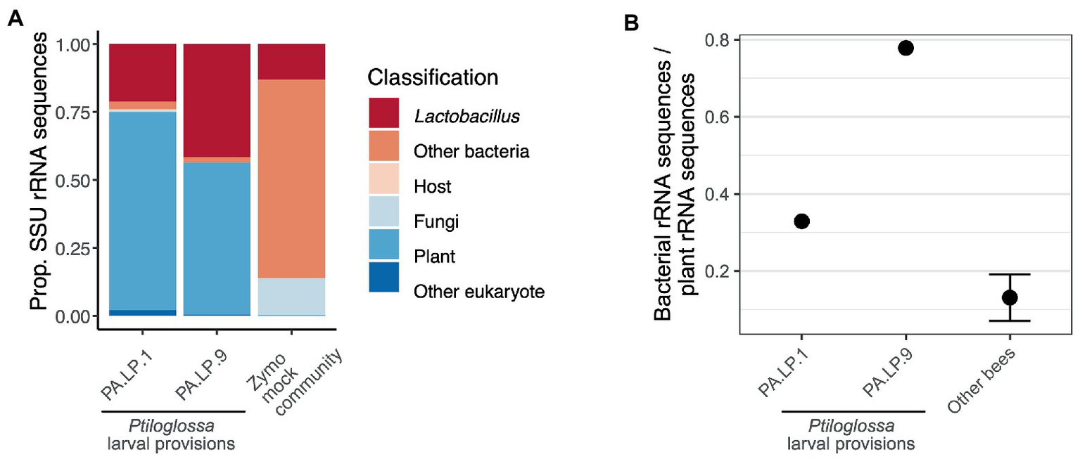 Figure 6. (A) Taxonomic composition of small subunit rRNA sequences in shotgun metagenomes of two Ptiloglossa larval provisions, and a mock community (Zymo). Sequences classified as “Other eukaryote” lacked any classification below the Domain level and may be artifactual. Note that among Ptiloglossa provisions sequences labeled “Other bacteria,” 79% are Lactobacillales (without a lower taxonomic classification). (B) The ratio of bacterial:plant rRNA sequences for metagenomes of two Ptiloglossa larval provisions, compared with metagenomes of larval provisions of apid and andrenid bees (9 bee species, 84 samples; unpub. data). For the latter, the mean +/− SEM is shown.