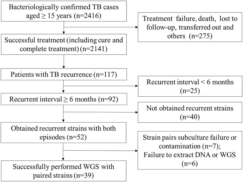A total of 2,416 bacteriologically confirmed TB cases aged 15 years or older were collected between Jan. 2013 and Dec. 2020. Of which, 88.6% (2141/2416) cases were successfully treated, while 275 (11.4%) patients experienced treatment failure, loss to follow-up, treatment interruption, adverse reactions, or death. Overall, 117 (5.5%, 117/2141) successfully treated cases that experienced TB recurrences, 25 recurrent TB cases were excluded due to their recurrent interval being less than 6 months, and finally, 92 recurrent TB cases were included in further analysis. Among them, 56.5% (52/92) had recurrent strains with both episodes. After excluding subculture failure or contamination of any paired isolates (n = 7) and failure to extract DNA or WGS (n = 6). Finally, 39 recurrent TB patients with paired strains were enrolled in the final analysis. Of these, one patient had a third episode during the study period, for a total of 79 MTB isolates and 41 recurrent events (Figure 1).