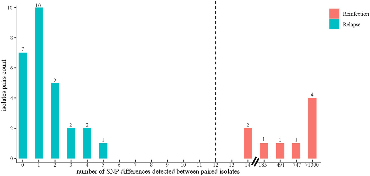 The distribution of SNP differences between paired isolates. Reinfection was defined as a recurrent disease episode caused by a new TB strain with a genetic distance of more than 12 SNPs compared with the strain that caused the original episode. Relapse was defined as a genetic distance of 12 or fewer SNPs between paired strains isolated from two episodes in TB recurrence. The SNP differences between paired isolates were calculated by using Snp-dists (v.0.8.2).