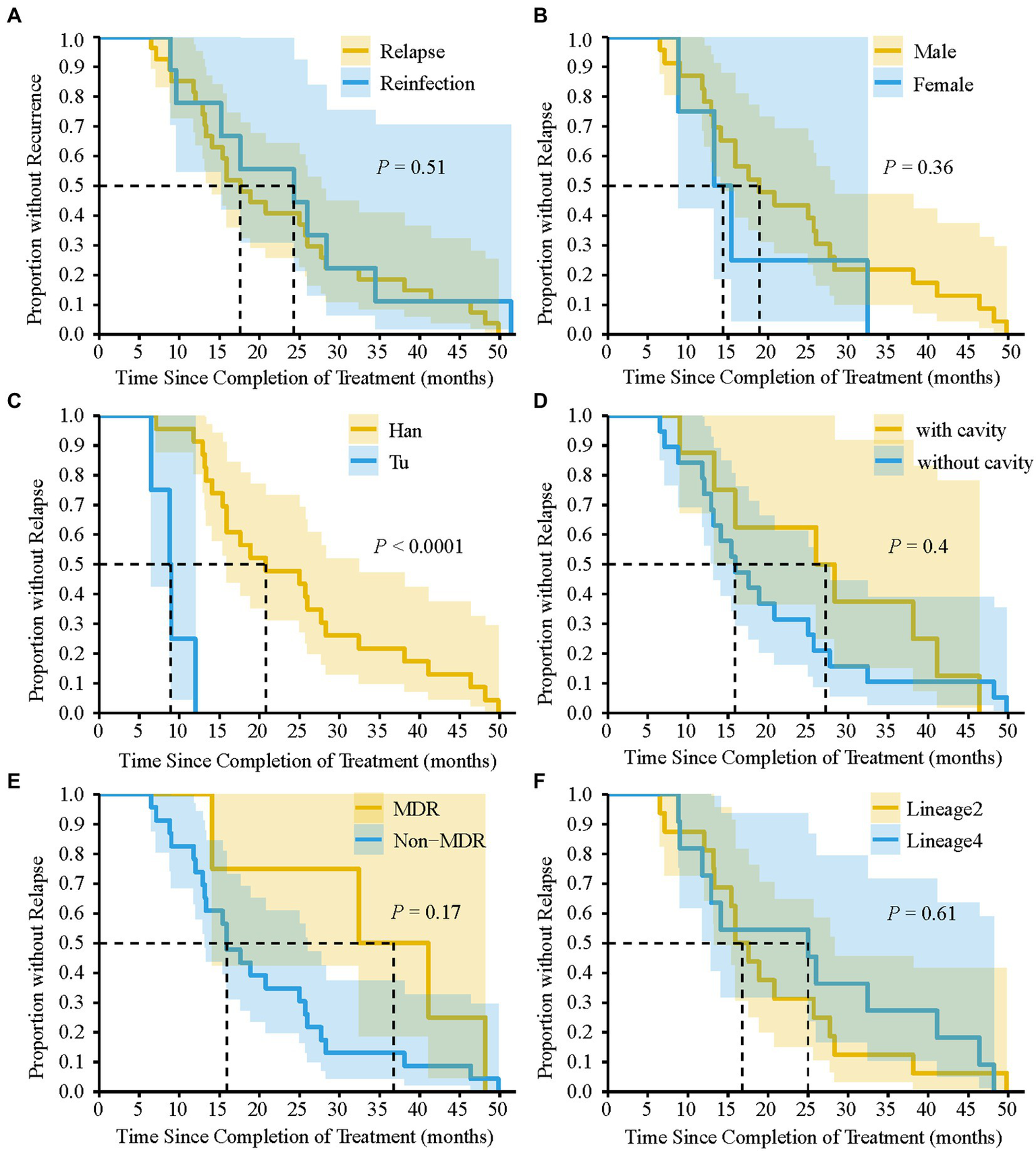 We analyzed the differences in the characteristics between TB relapse and reinfection. As summarized in Table 2, all these demographic factors and clinical characteristics of patients, such as gender, age, occupation, and comorbidities et al., as well as genetic background and drug-resistant type of strains, had no significant effect on the proportion of TB relapse (all p > 0.05). In addition, more than 80% of TB recurrence occurred within three years after completion of treatment for the index episode (Table 2). The median of the recurrent time interval to relapse was 17.6 months (IQR, 12.9–28.3 months) compared with 24.3 months (IQR, 12.9–31.5 months) for reinfection cases, and there was no significant association between relapse and earlier recurrence (p = 0.51) (Figure 4A). We further assessed the time interval to relapse stratified by gender, nationality, pulmonary cavity, strain drug-resistant type, and genetic background. As shown in Figure 4, TB relapse occurs earlier in patients of Tu ethnicity compared to patients of Han ethnicity (p < 0.0001), whereas no significant differences in the time interval to relapse were noted in other groups.