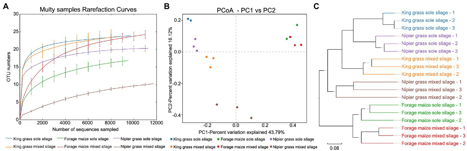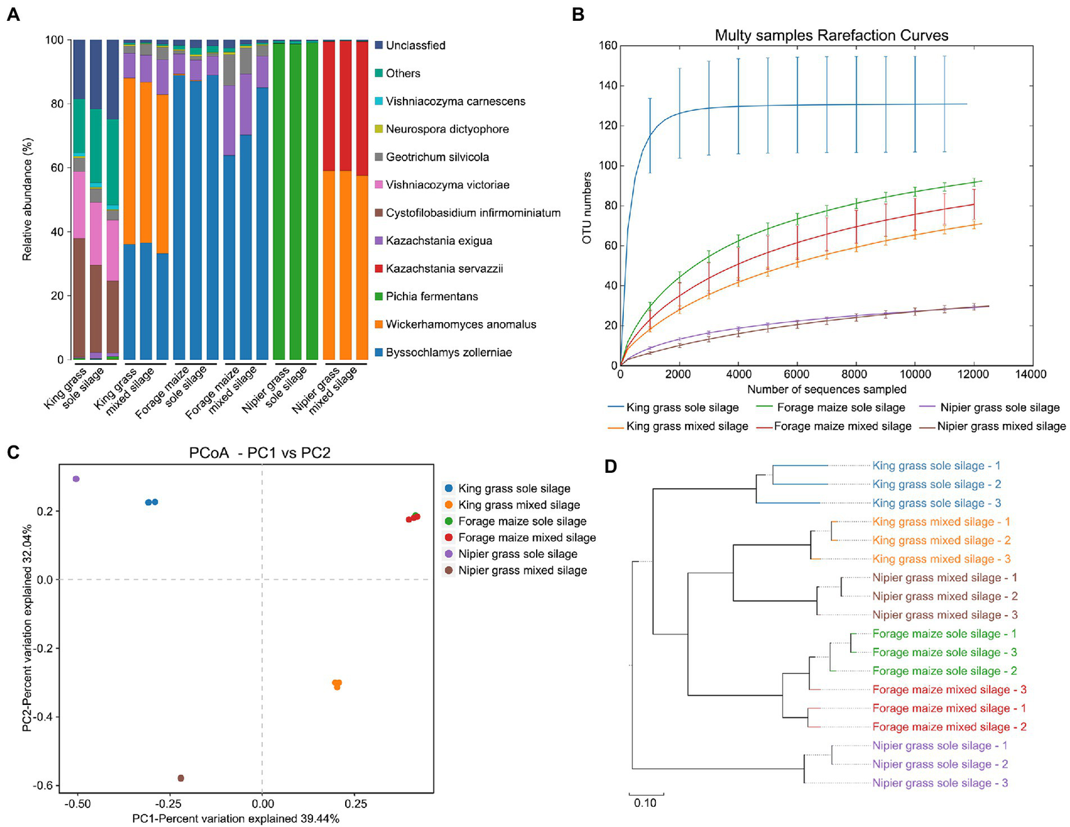 The rarefaction curve showed the α-diversity of fungal community diversity within samples (Figure 3B). Notably, microbial communities from sole silages were significantly more diverse than those from mixed silages. The sole silage of king grass had the highest diversity, followed by the sole silages of forage maize and Napier grass. The mixed silage of king grass and forage legumes had a significant decrease in the abundance and diversity of fungal communities. PCoA, conducted based on the weighted UniFrac distance matrix in combination with PERMANOVA, revealed that the microbiota of silages separated along the first coordinate (Figure 3C). Sole and mixed silages of forage maize were clustered together, whereas those of king grass and Napier grass were separated in both sole and mixed silages. Thus, ensiling method affects the fungal communities of king grass and Napier grass but not forage maize. Mixed silages of king grass and Napier grass exhibited similar species composition in UPGMA clustering, which was distant from the sole silages of the two grasses (Figure 3D).