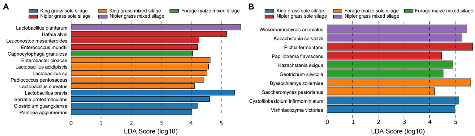 The linear discriminant analysis (LDA) effect size (LEfSe) method was used to examine the differences in microbial communities between samples and identify the bacteria and fungi in each sample (LDA score > 4.0) capped at p-value <0.05 (Figure 4). The biomarkers of bacterial taxa in sole silages of king grass were L. brevis, S. proteamaculans, Clostridium guangxiense, Pantoea agglomerans, and unidentified bacteria belonging to Enterobacteriales and Caloramatoraceae. In king grass mixed silage, the bacterial biomarkers were E. cloacae, Lactobacillus acidipiscis, Lactobacillus curvatus, and Pediococcus pentosaceus. The discriminatory bacterial biomarkers for the sole silage of Napier grass were H. alvei, Leuconostoc mesenteroides, and Enterococcus mundtii. By contrast, in Napier mixed silage, L. plantarum was discriminant. For biomarkers of fungal taxa, six differentially abundant species in sole silages and four in mixed silages were identified. In sole silages, C. infirmominiatum and V. victoriae were discriminant in king grass, B. zollerniae and Saccharomyces pastorianus were discriminant in forage maize, and P. fermentans and Papiliotrema flavescens were discriminant in Napier grass. In mixed silages, fungal biomarkers were identified only in forage maize and Napier grass and included K. exigua and G. silvicola in forage maize and W. anomalus and K. servazzii in Napier grass.