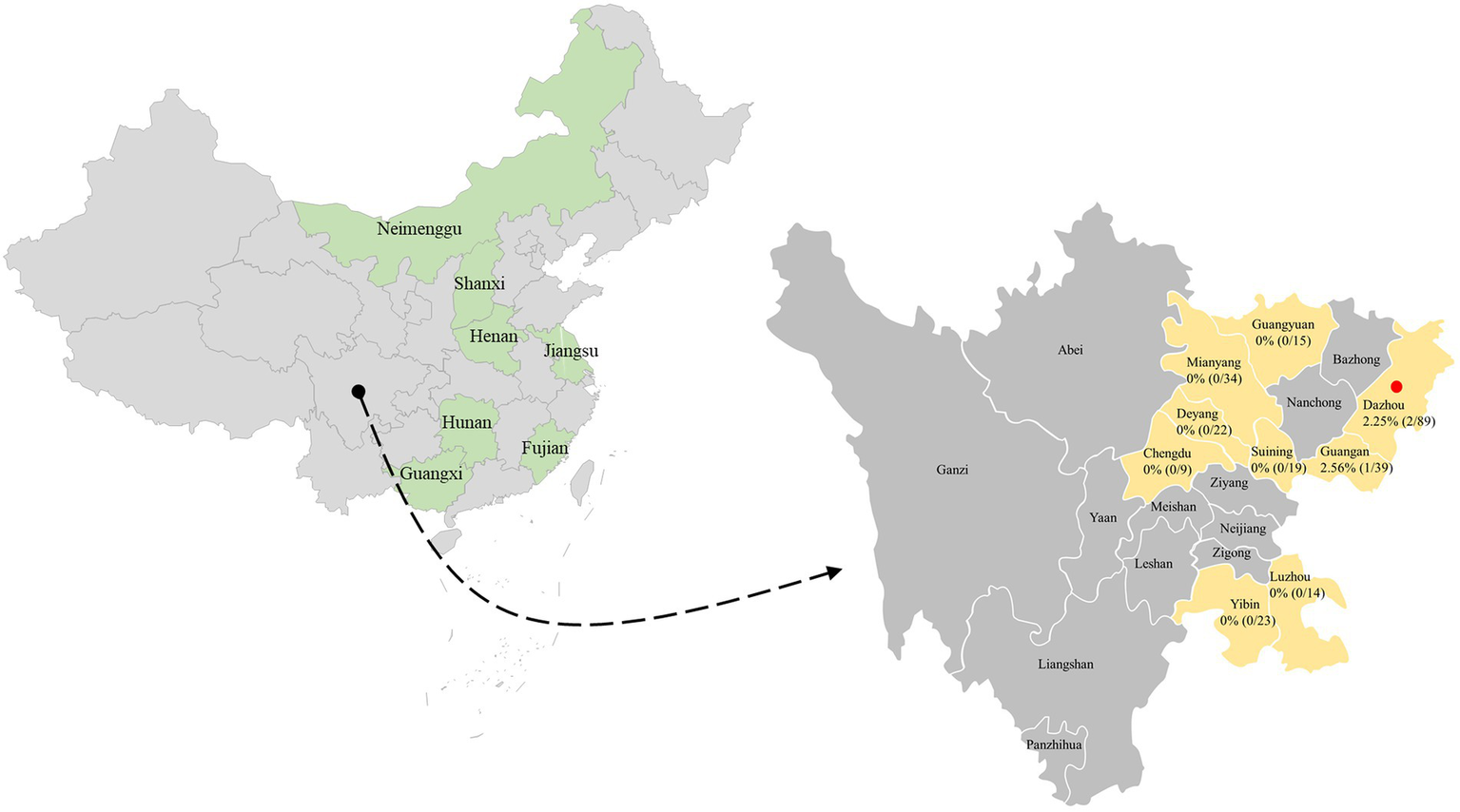 The geographical distribution of the 264 samples. In China, the provinces with PCV4 identification were filled with light green. The clinical samples in this study were collected from light gold-filled cities in southwestern China, and cities with positive samples were marked by red solid circles. The numbers indicate the positivity rate of PCV4 in different cities.