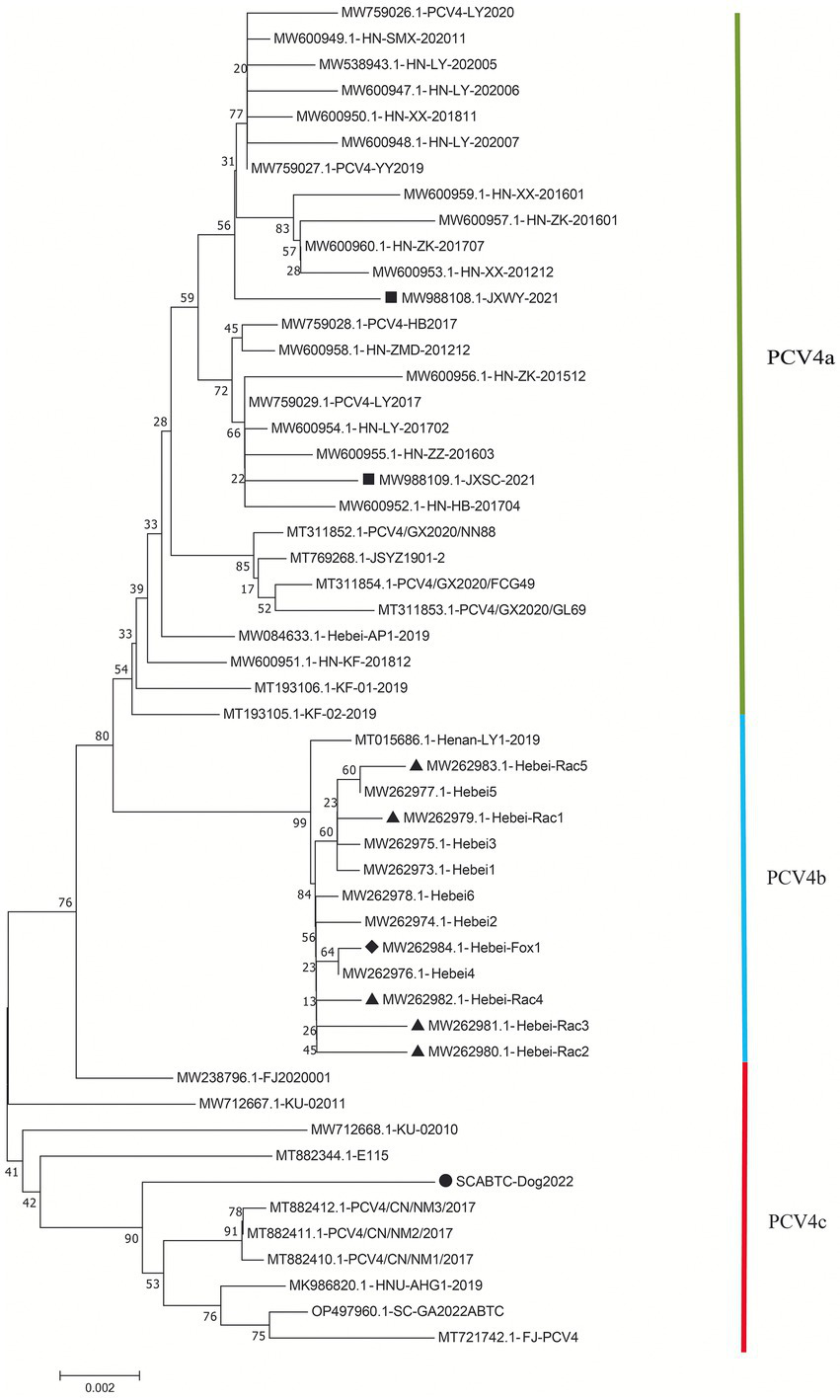 Neighbor-joining trees were constructed with a p-distance model and bootstrapping at 1,000 replicates. Phylogenetic tree was constructed based on the complete genome of 52 PCV4 strains. The black solid triangle (▲) represented the PCV4 strains derived from raccoon dogs. The solid black diamond (◆) represented the fox-derived PCV4 strains. The solid black square (■) represents the PCV4 strains originating from wild boars. The black solid circle (●) represented the dog-derived PCV4 strain (SCABTC-Dog2022) in this study. All unlabeled strains were from domestic pigs. The subtypes were proposed by Xu et al. (2022a).