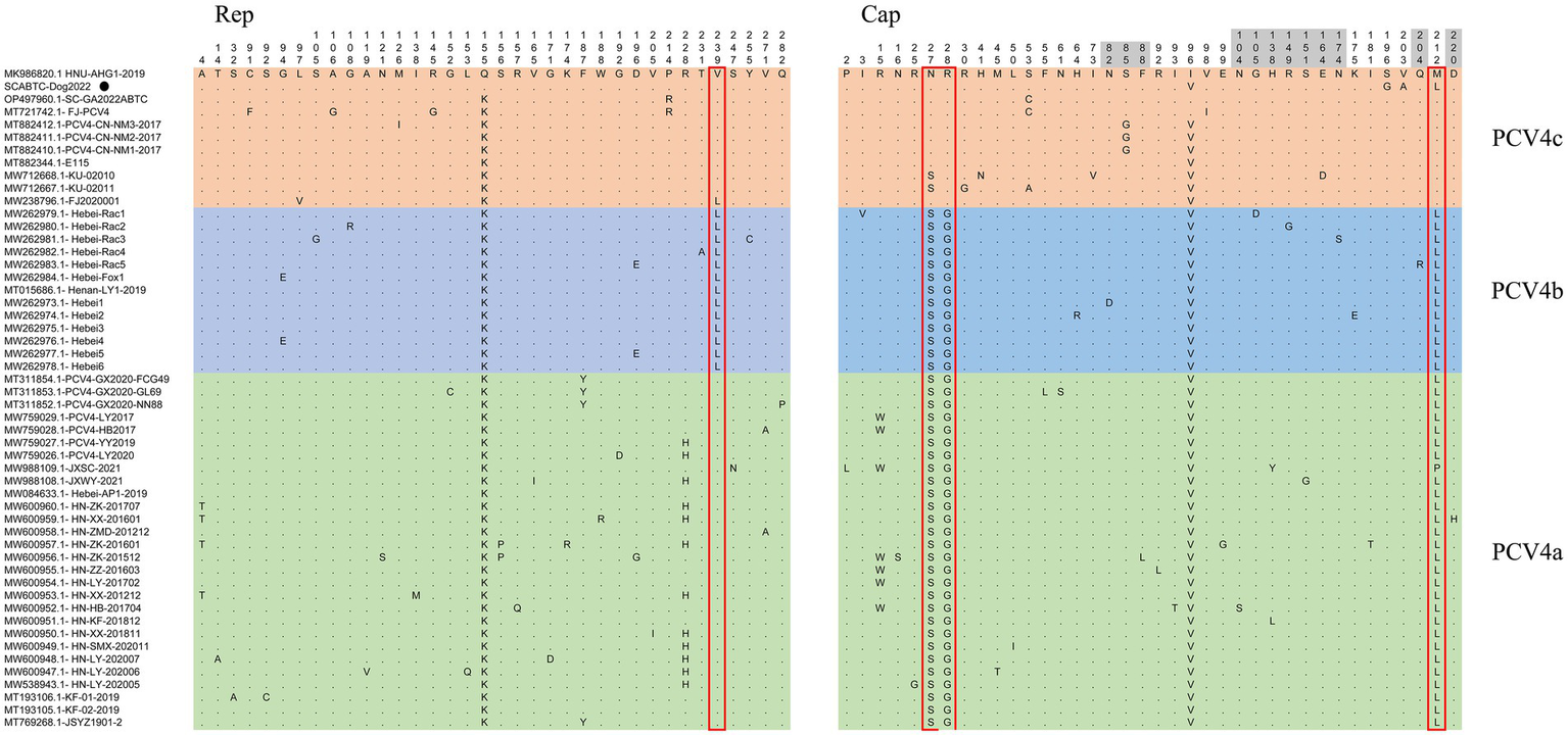 Sequence alignment analysis indicated that there were 36 and 38 amino acid mutations in the Rep and Cap of 52 PCV4 strains. The light green, light blue and light orange colors indicated PCV4a, PCV4b, and PCV4c proposed by Xu et al. (2022b). The red open box showed the specific amino acid patterns of genotypes. Amino acid residues in gray areas contained represented in potential linear B-cell epitopes.