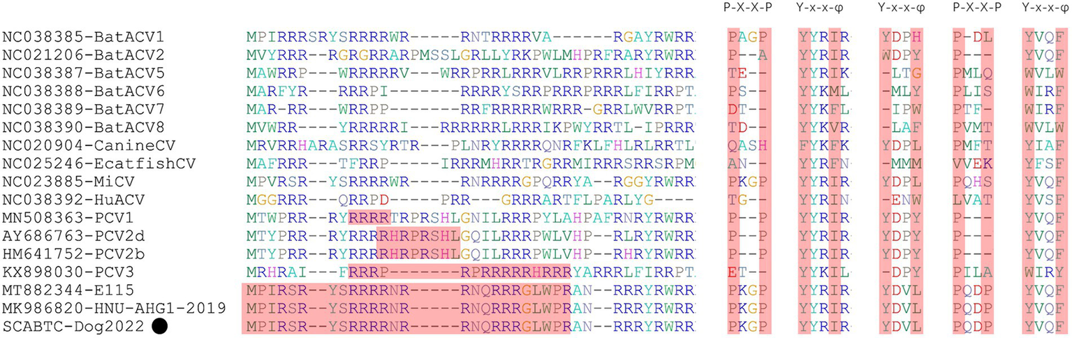 The NLS regions of PCVs (PCV1-4) were highlights in red and reported in several studies (Liu et al., 2001; Shuai et al., 2008; Mou et al., 2019; Wang et al., 2021). The P-x-x-P and Y-x-x-φ patterns were first identified in other viruses belonging to the genus Circovirus. However, the second P-x-x-P was only detected in PCV4 strains (Nguyen et al., 2022). The “x” indicates any amino acid, and “φ” represents any of F (phenylalanine), I (isoleucine), L (leucine), or V (valine). The black solid circle (●) represented the dog-derived PCV4 strain (SCABTC-Dog2022) in this study.