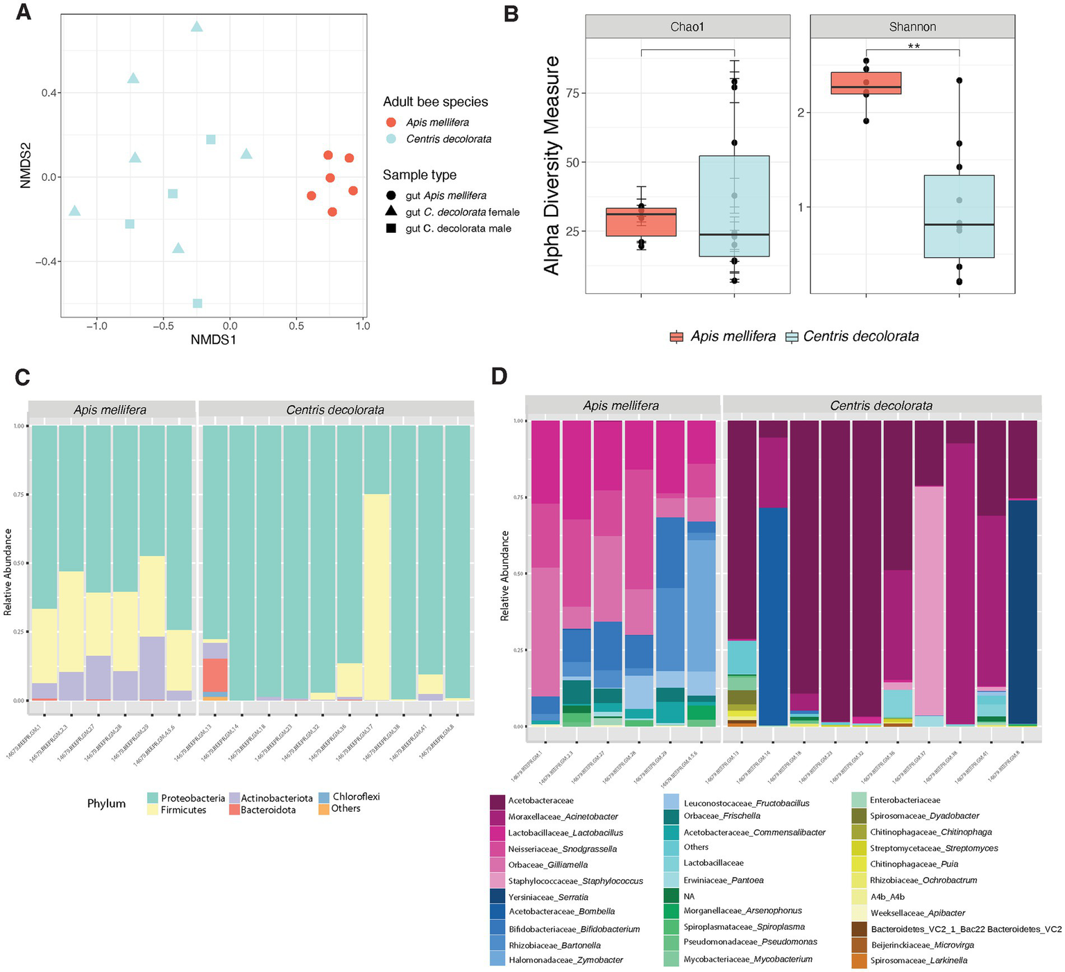Figure 2. Diversity analyses comparing the microbiota of the two species of bees Apis mellifera (social) and Centris decolorata (solitary). (A) Beta diversity analysis, represented in a 2D NMDS with Bray-Curtis distances for species and sample types, depicts distinct clustering between the brood cell content and the adult bee with PERMANOVA value of p = 0.001; ANOSIM value of p = 0.001. (B) Alpha-diversity among species using Chao1 and Shannon indices. Asterisks depict significant values (*, **, *** representing 0.05, 0.01, 0.001, respectively). Bar Plots show the relative abundance (minimum 5%) of bacteria at the phyla (C), and genus levels (D).