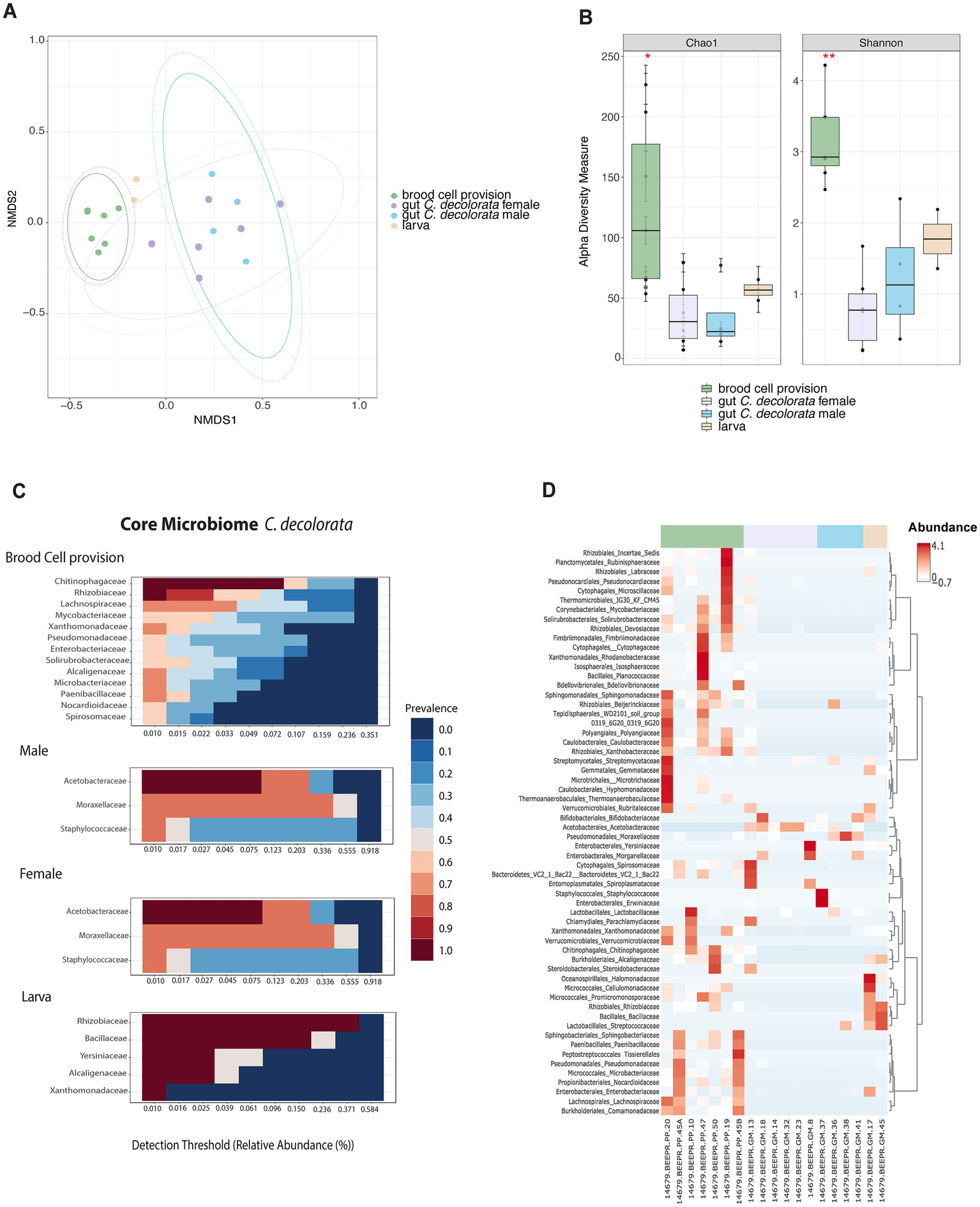 Figure 4. Overview of microbiota analyses for Centris decolorata samples (n = 19) considering larva and brood cell provisions. (A) Beta diversity analysis, represented in a 2D NMDS with Bray-Curtis distances for Centris decolorata samples, depicts distinct clustering between the brood cell content and the adult bee with PERMANOVA value of p = 0.001; ANOSIM value of p = 0.001. (B) Alpha-diversity among C. decolorata samples using Shannon index, stars are showing significative values, Shannon value of p between brood cell content and female = 0.001, and between brood cell content and male = 0.05. Heatmaps showing the relative abundance of the bacterial phylum-level (assigned per phylum) (C) Core bacterial biota at the family-level per each C. decolorata sample groupings, corresponding to taxa detected in a fraction of at least 50% of individuals with greater than 0.01% of relative abundance. Prevalence is show as heat colors (D) Taxonomic heatmap at the order and family-level for each sample groups.