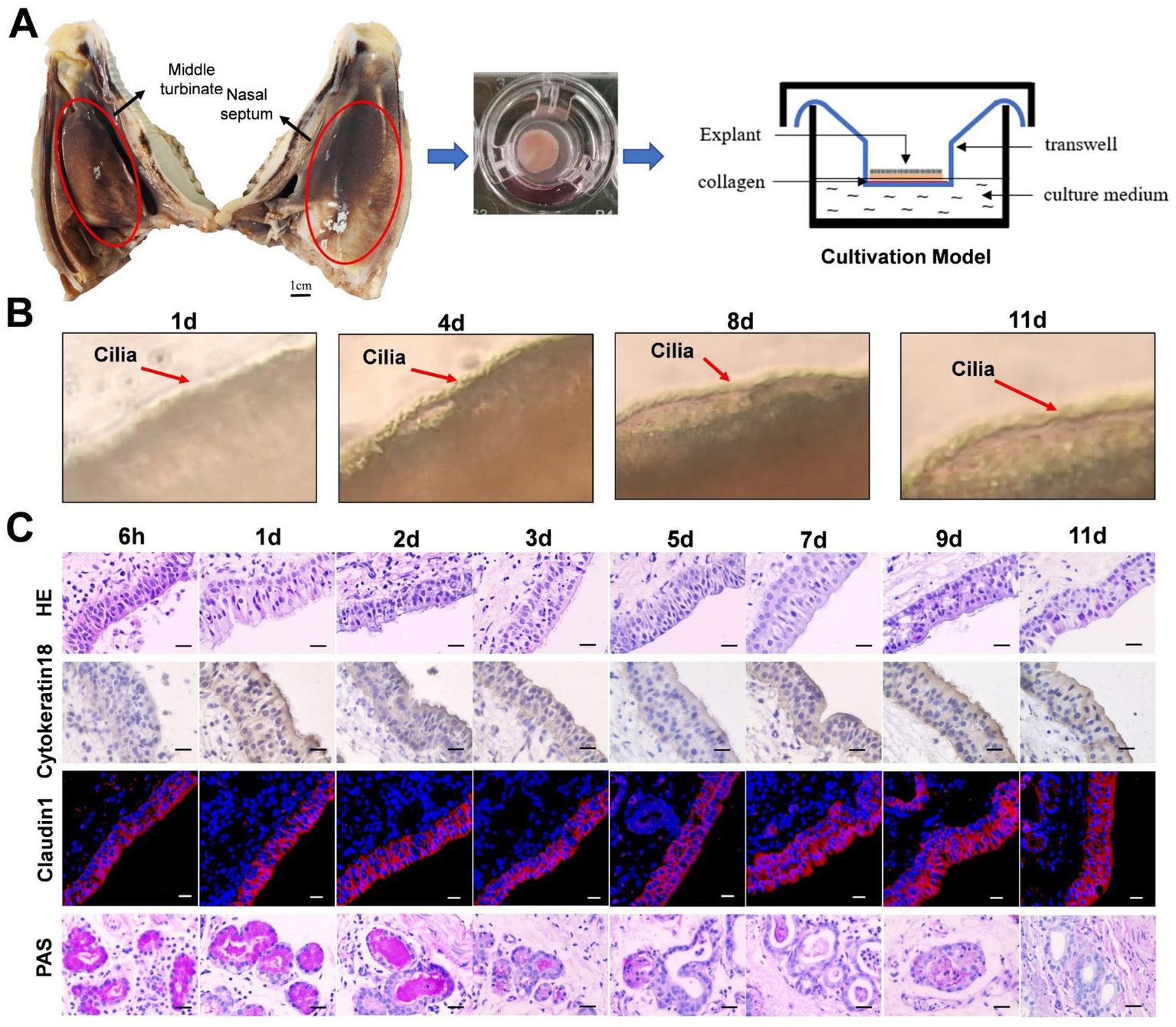 The establishment of sheep nasal mucosa explant culture models. (A) Construction of the air-liquid culture model of sheep nasal mucosa explants. (B) The cilia wiggling of sheep nasal mucosa explants were observed under light microscope. (C) HE staining for evaluate of the structure characteristics. The expression characteristics of cytokeratin18 were observed by immunohistochemistry. The Claudin1 was used to evaluate the integrity of epithelial barrier by immunofluorescence. The PAS was used to observed the secretory characteristics of the subcutaneous glands. The nasal mucosa explants of sheep at different times were obtained from three mucosal tissues of three sheep. Scar bar = 50 μm.