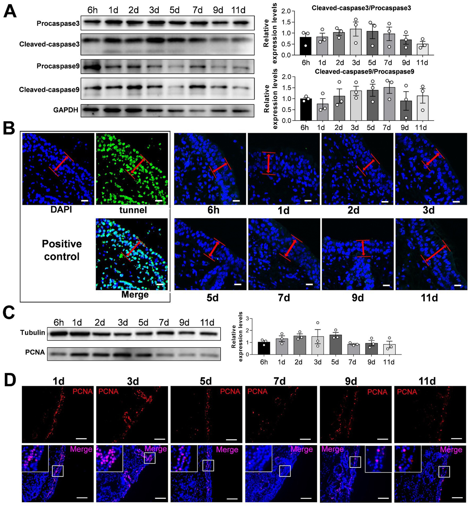 Detection of apoptosis and proliferation of sheep nasal mucosa explants. (A) Western blot was used to detect the expression of Procapase3, Cleaved-caspase3, Procapase9 and Cleaved-caspase9 in sheep nasal mucosa explants at different culture time points (6 h, 1 d, 2 d, 3 d, 5 d, 7 d, 9 d, and 11 d). Statistical diagram of protein expression of Cleaved-caspase3/Procapase3 and Cleaved-caspase9/Procapase9. (B) Tunnel kit was used to detect the apoptosis of sheep nasal mucosa explants at different time points (6 h, 1 d, 2 d, 3 d, 5 d, 7 d, 9 d, and 11 d). The red arrows represent the epithelial layer (C,D) Western blot and immunofluorescence were used to detect the proliferation characteristics of nasal mucosa explants at different time points. The nasal mucosa explants of sheep at different times were obtained from three mucosal tissues of three sheep. Scar bar = 50 μm.