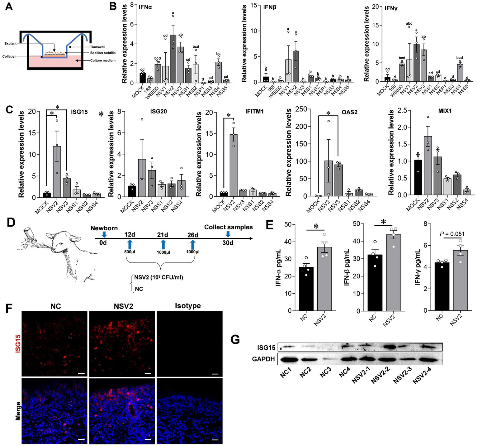 The effect of sheep-derived Bacillus subtilis on innate immune factors in nasal cavity. (A,B) Quantitative detection of IFN-α, IFN-β, and IFN-γ in sheep nasal mucosa explants with pretreat sheep-derived Bacillus subtilis (NSV1, NSV2, NSV3, NSS1, NSS2, NSP1, NSS3, NSS4, and NSS5). (C) Quantitative detection of ISG15, ISG20, IFITM1, OAS2, and MIX1 in sheep nasal mucosa explants with pretreat sheep-derived Bacillus subtilis (NSV2, NSV3, NSS1, NSS2, and NSS4). The nasal mucosa explants of sheep were obtained from three mucosal tissues of three sheep. (D) The sheep derived NSV2 was used to pray the nasal cavity of the lamb (n = 4) three times. (E) The levels of IFN-α, IFN-β and IFN-γ in nasal lavage fluid after treatment with NSV2 detected by ELISA. (F,G) The expression of ISG15 detected by immunofluorescence and Western blot. Different letters indicate significant differences. Scar bar = 20 μm.