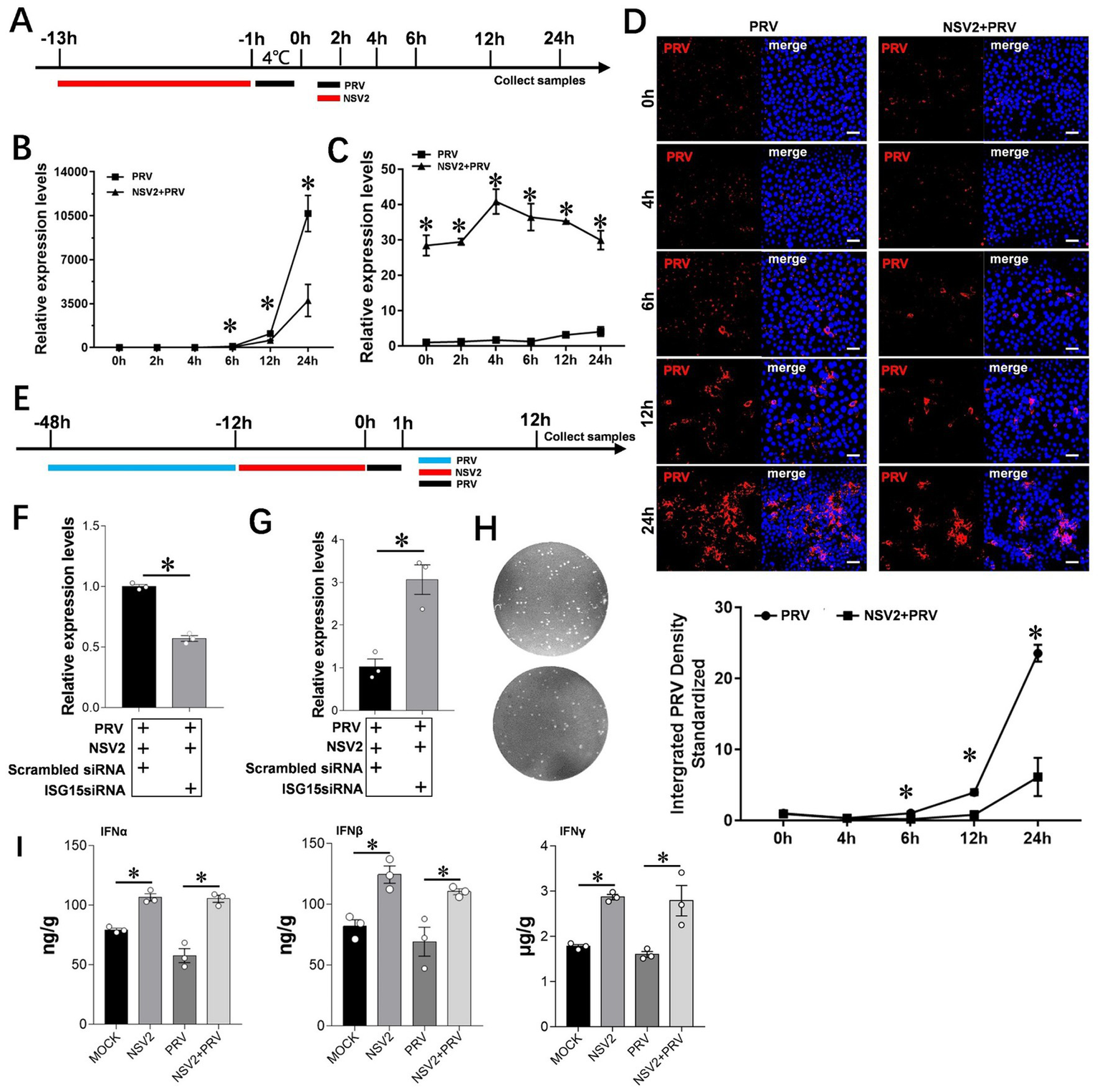 Interference with ISG15 to inhibit the resistance of NSV2 to PRV infection. (A) After the PK15 were pretreated by NSV2 for 12 h, inoculated with PRV (MOI = 0.1) for 1 h, and then collect samples at different time points (0 h, 2 h, 4 h, 6 h, 12 h and 24 h). (B and C) Quantitative detection of PRV and ISG15 levels after treatment with NSV2 at different time points. (D) The pathological characteristics after treatment with NSV2 detected by immunofluorescence at different time points. (E) After 36 h of transfection with siISG15, the cells were inoculated with 250 μL of NSV2 suspension for 12 h and infected with PRV (MOI = 0.1) for 1 h and then collect samples at 12 h. (F–H) Quantitative detection of ISG15 and PRV levels, and detection the viral load in culture supernatants with plaque assay. (I) The levels of IFN-α, IFN-β and IFN-γ after treatment with NSV2 detected by ELISA. Scar bar = 50 μm.