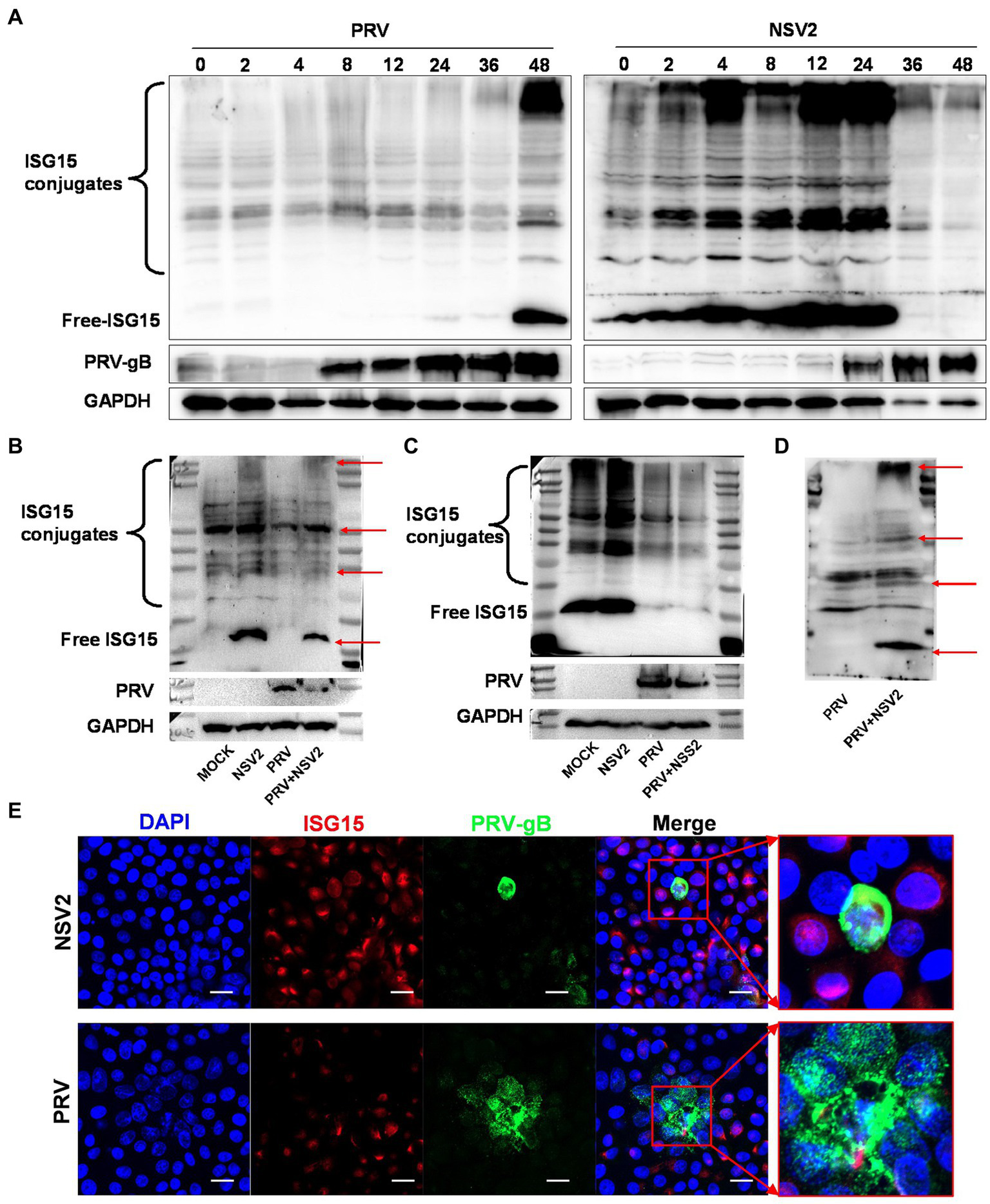 NSV2 inhibit PRV infection by ISGylation. (A) The expression and binding of ISG15 in PK15 cells infected with PRV and treated with NS2 at different time points were detected by Western blot. (B–D) Comparison of ISG15 expression and binding between PK15 cells infected with PRV and treated with NSV2/NSS1/NSV3. (E) The colocalization of PRV and ISG15 detected by immunofluorescence. Scar bar = 20 μm.